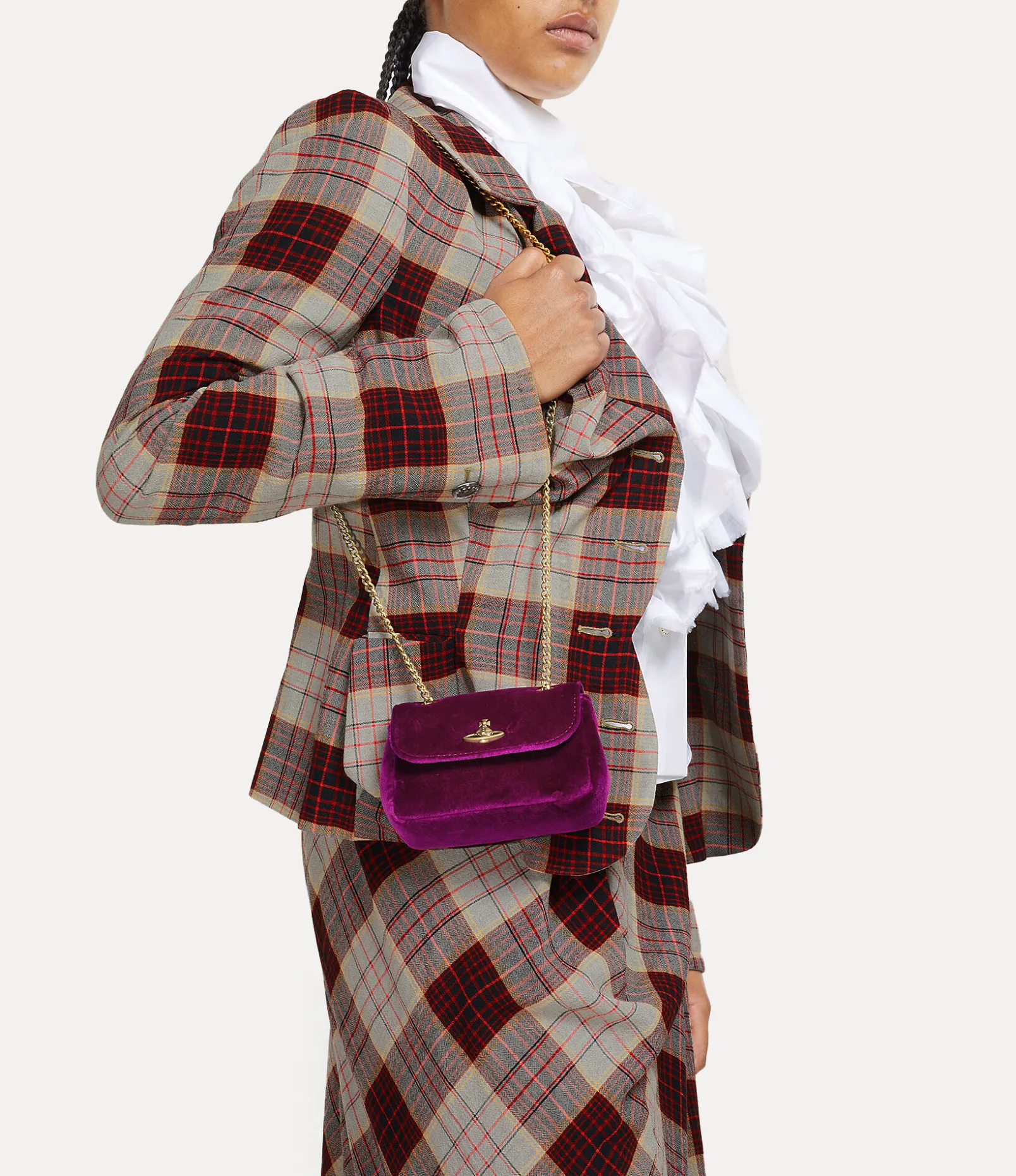 Our Small purse receives a rectangular silhouette, complete with a classic brass chain and an antique gold-tone orb plaque on the magnetic closure – recalling Vivienne’s vision of launching tradition into the future. The piece adopts a soft cotton velvet finish, paying homage to the opulent furniture of the early 19th century, a key influence for this season’s collection.