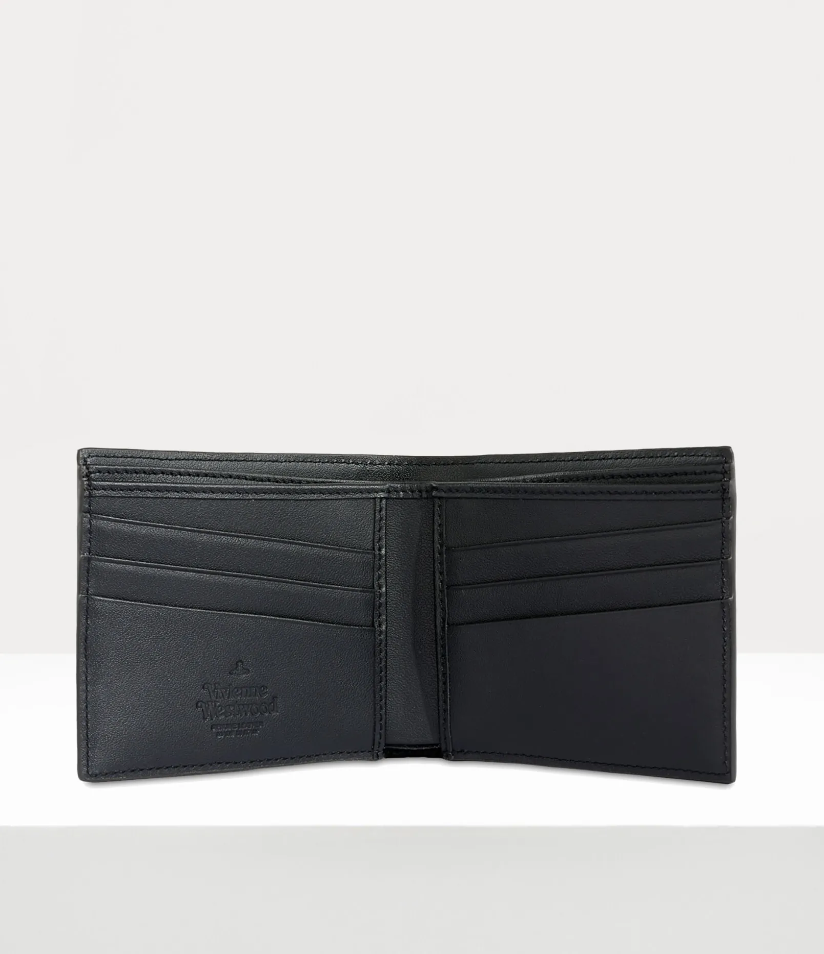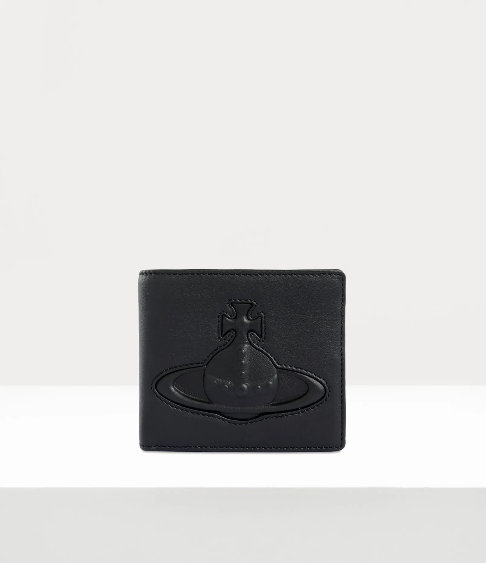 Our Man Billfold wallet in leather showcases a smooth surface with the phrase ‘Vivienne Westwood’ inscribed on the interior panel. The piece receives a three-dimensional injected orb motif on the front panel – recalling Vivienne’s vision of launching tradition into the future.