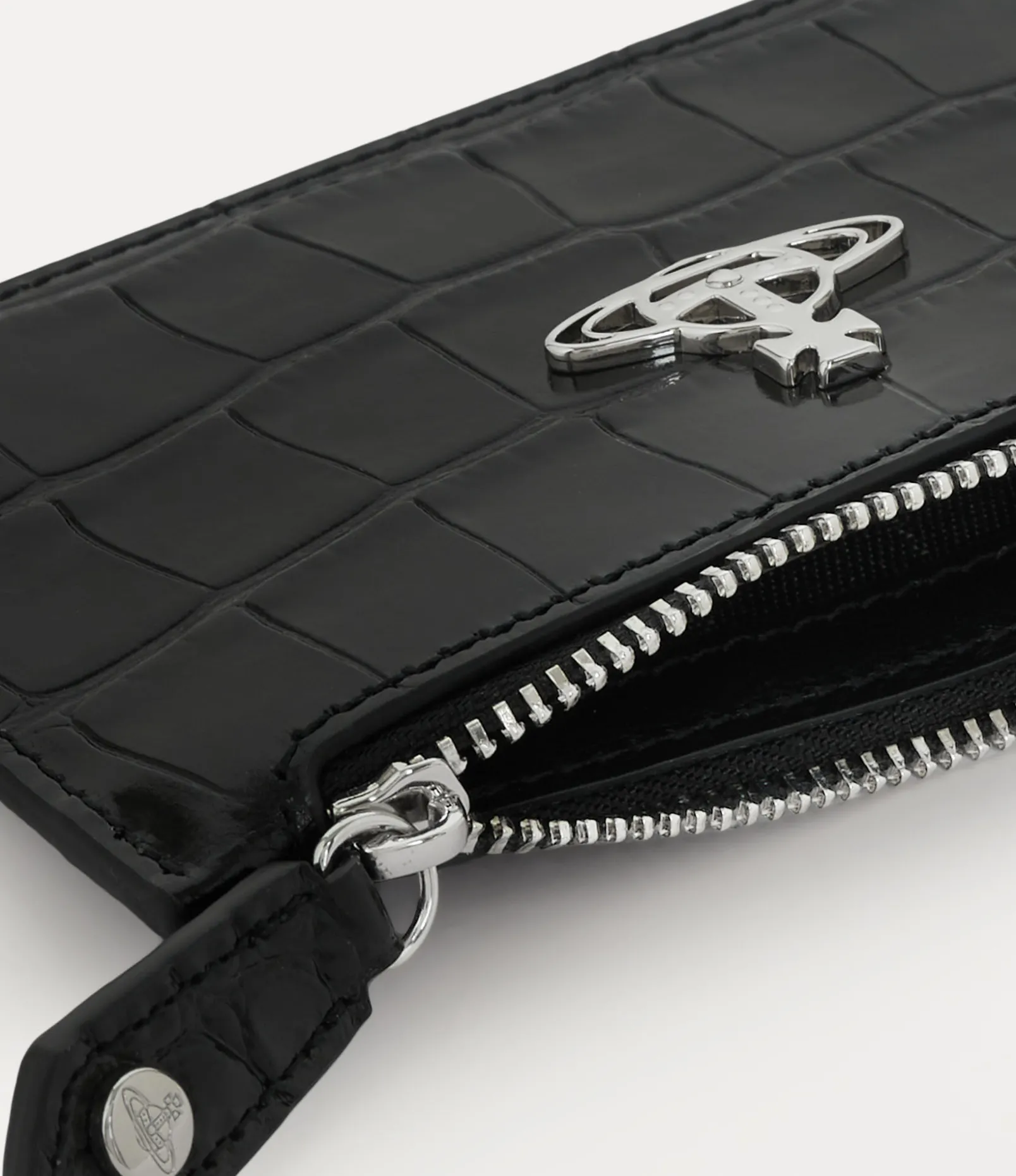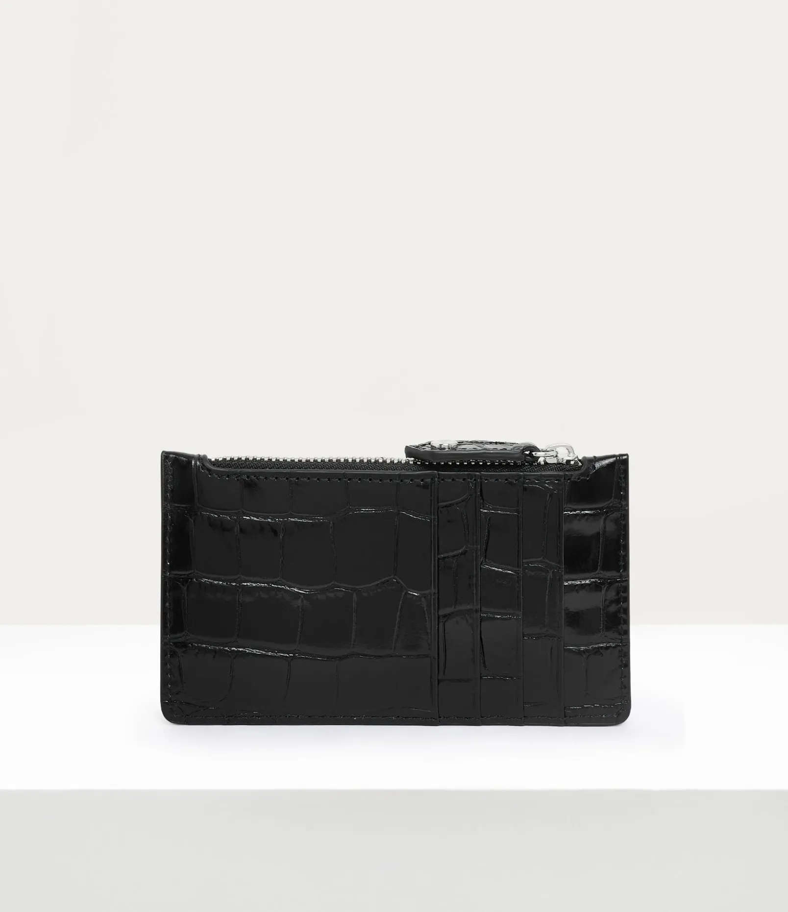 The Slim Long card holder is made of croc-embossed leather and features an engraved zip closure, four card slots on the back and a lined version of our orb on the front in silver tones.