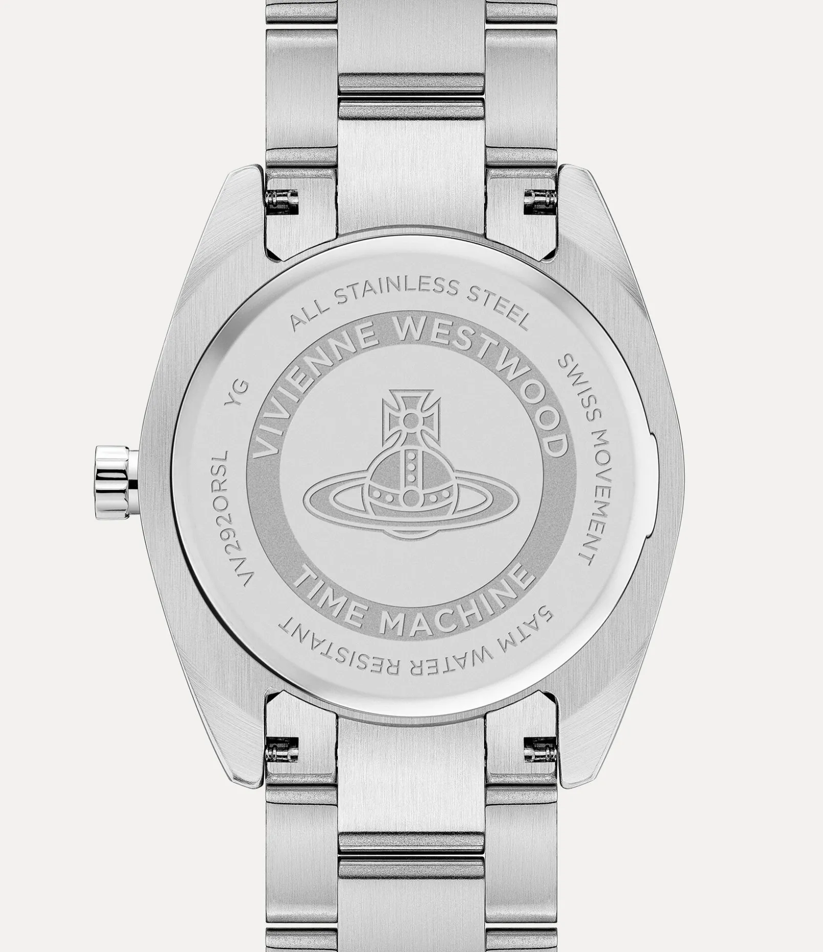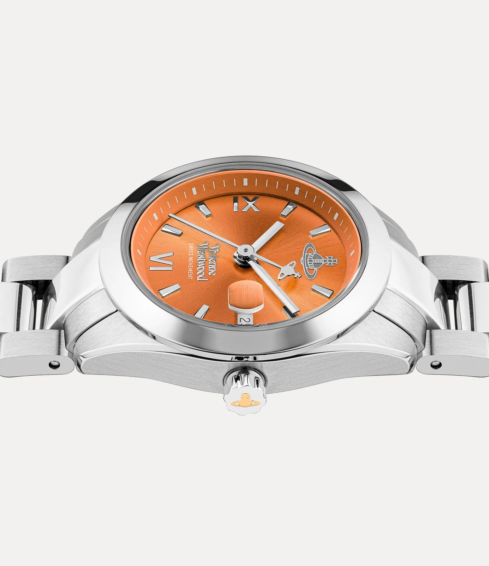 Part of our popular Fenchurch collection, this season’s Fenchurch watch features a distinctive three-link bracelet, finished in polished silver tones. Named after London’s historic financial district, which resonated with Vivienne, this piece is detailed with a date feature at the three o’clock position, complete with an orange dial.