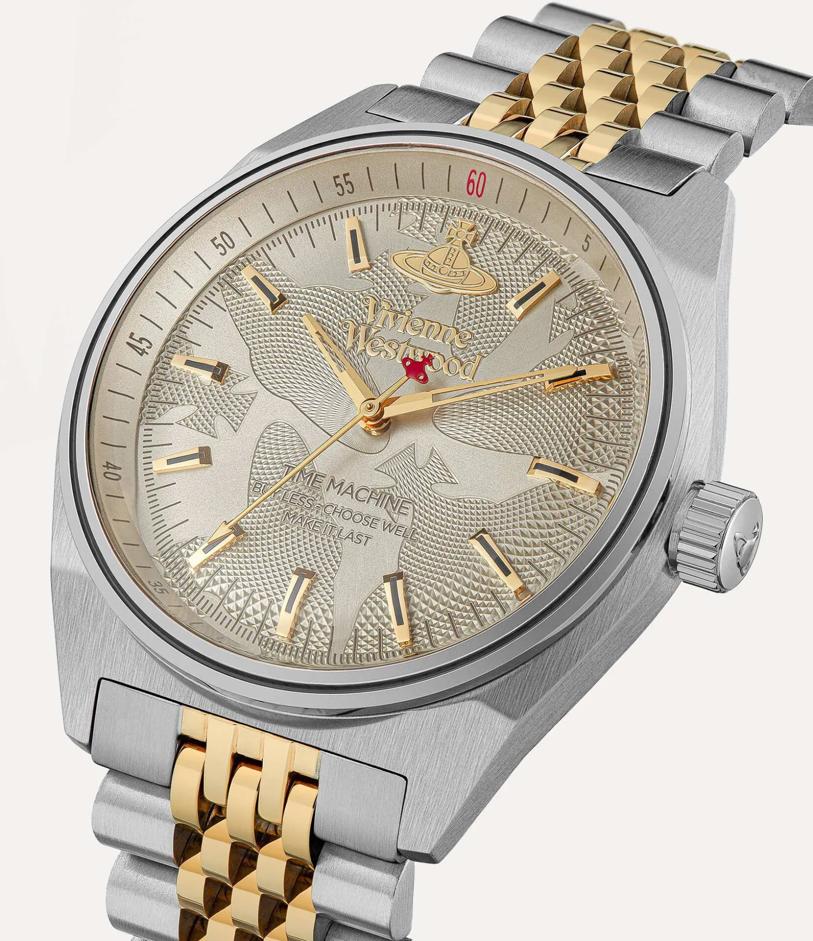 Vintage luxury sports inspire this season’s Lady Sydenham watch, featuring gold-tone indices, complete with a two-tone bracelet and an intricate jacquard-etched dial. The piece receives a contoured case, adorned with a polished orb motif at the 12 o’clock marker – synonymous with Vivienne’s vision of launching tradition into the future.