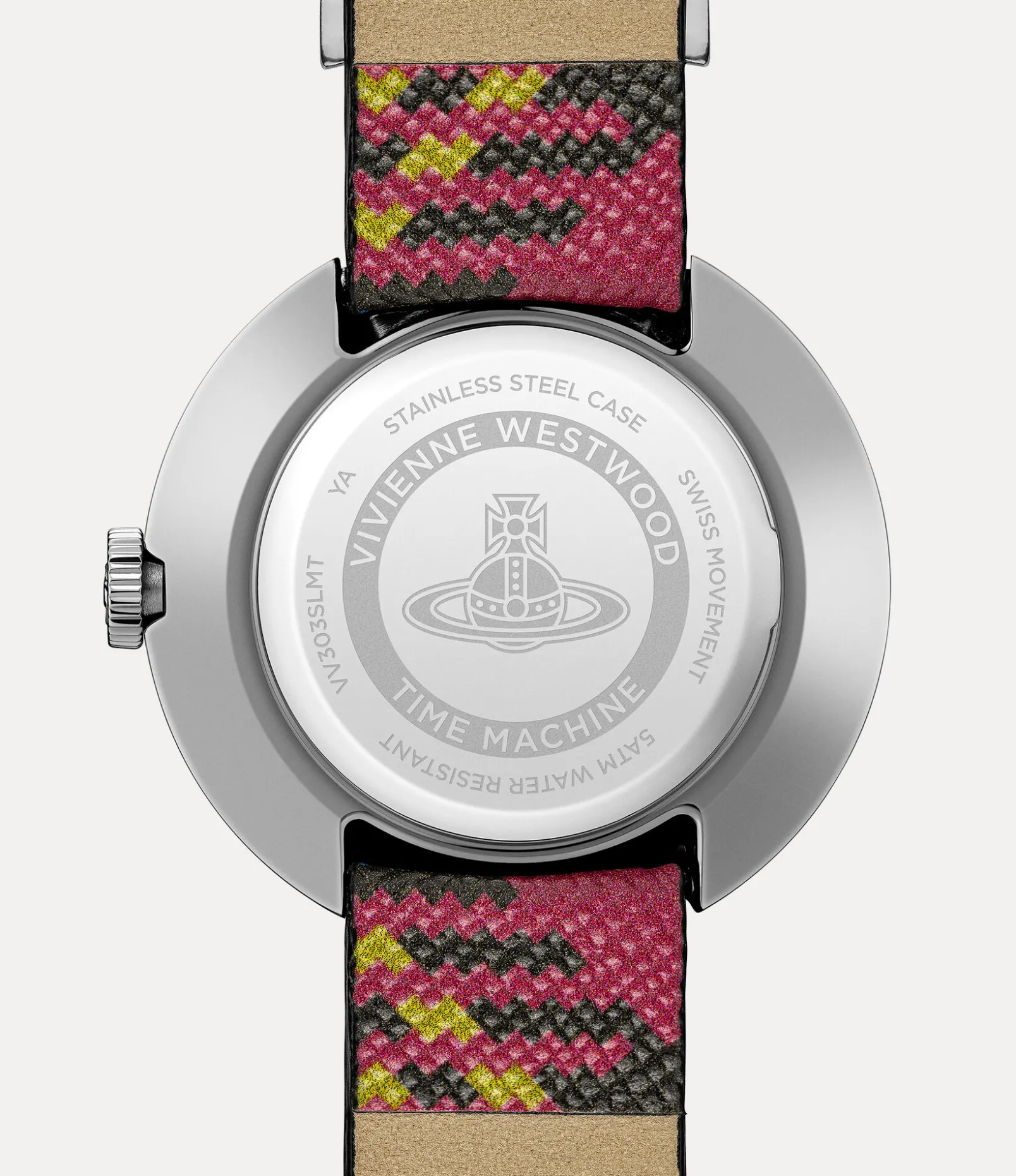 The tartan motif is an essential element of the house’s iconography, reminiscent of Vivienne’s signature punk style. The Rebel watch receives a tartan motif printed across the strap, complete with our archival ‘SEX’ lettering detail, first seen on the Sex choker from our collection from 1989.