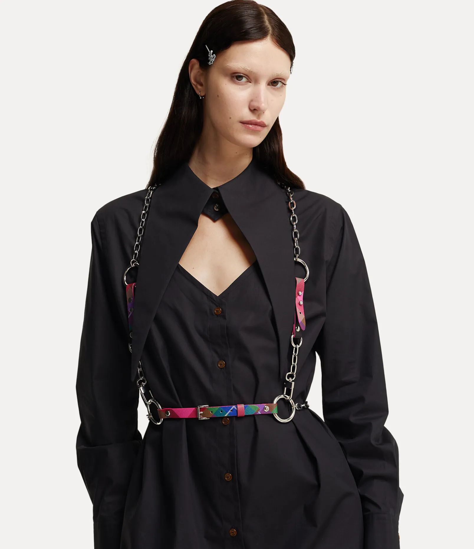 Our Chain harness features this season’s ‘Candy Tartan’ morif, complete with bondage-inspired elements, reminiscent of our ‘Erotic Zones’ collection from Spring-Summer 1995. The silver-tone chain detail is finished with our classic orb branding, evoking Vivienne’s vision of taking tradition into the future.