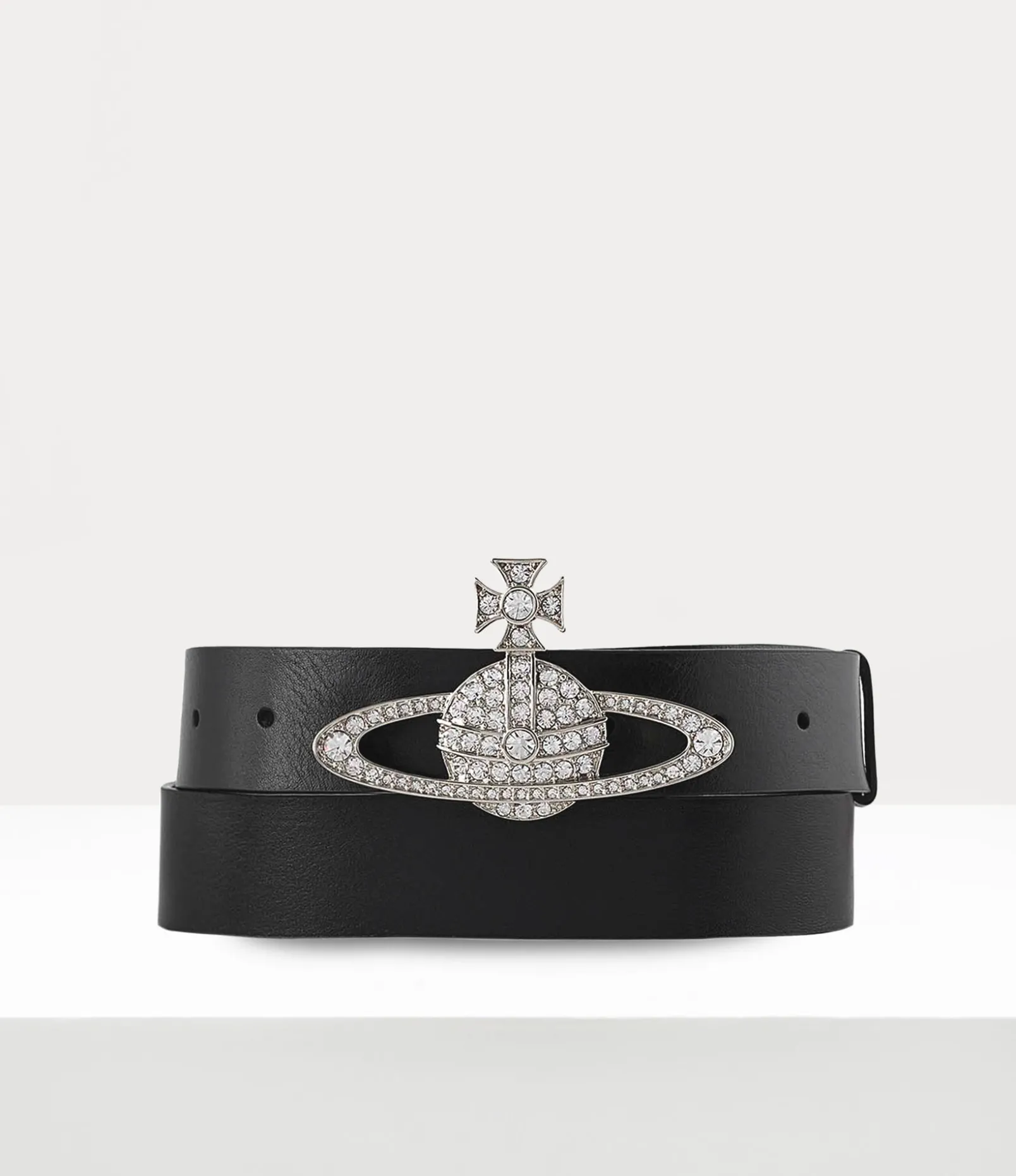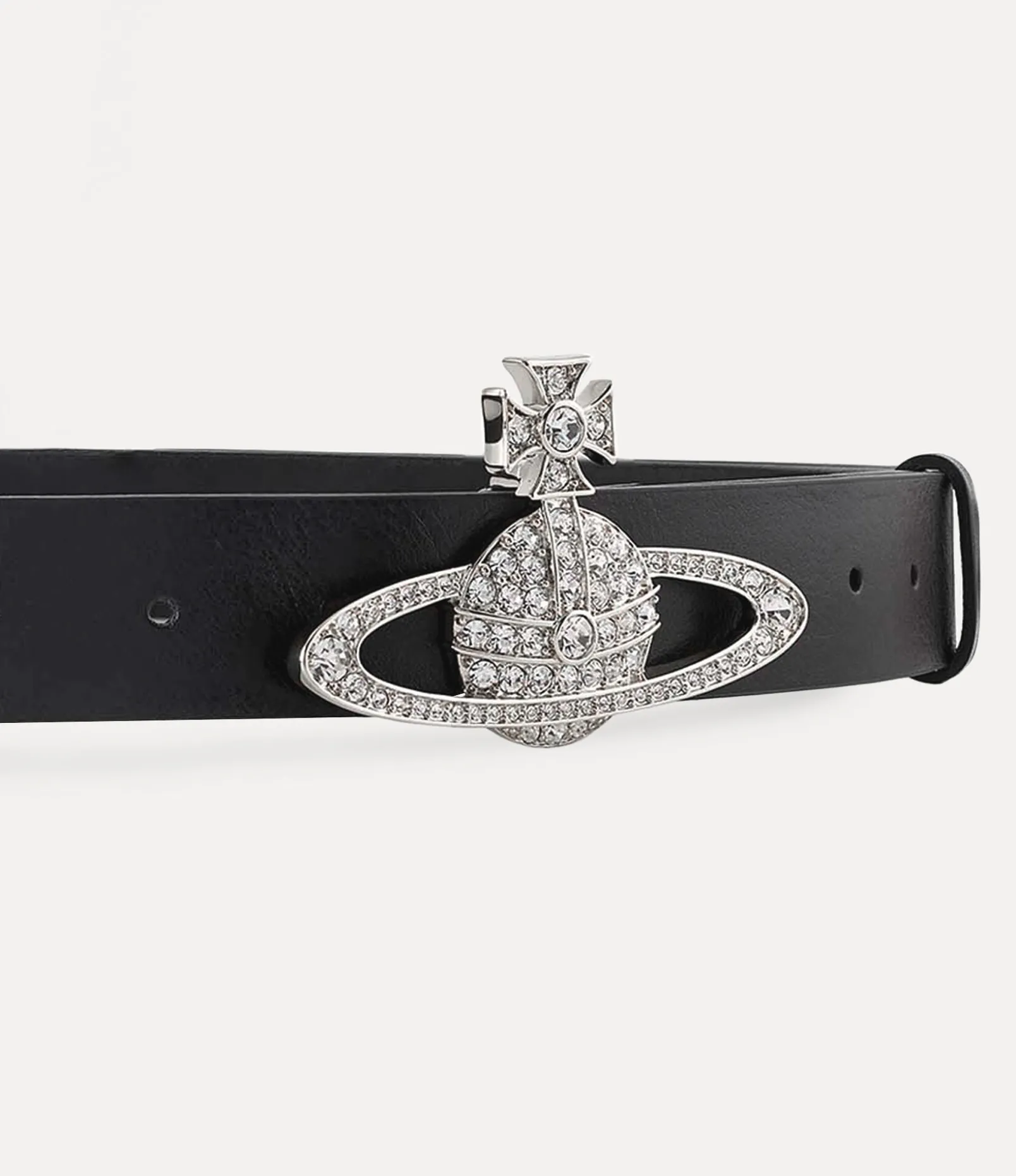 Our house’s signature orb motif recalls Vivienne’s vision of launching tradition into the future. This season, the Medium Bas Relief belt receives a two-dimensional orb silhouette on the buckle, adorned with rows of glistening white crystals, complemented by silver-tone metal hardware details.