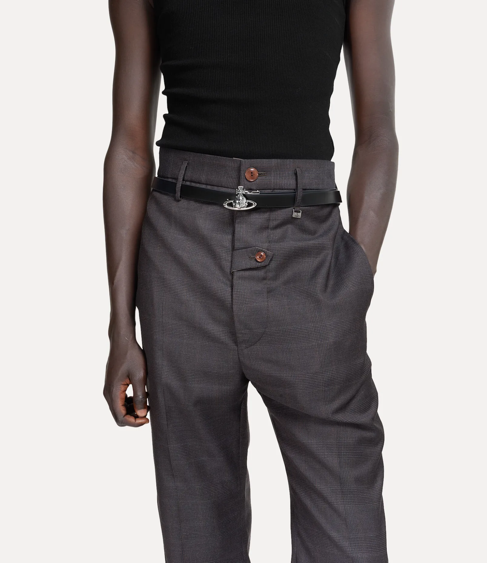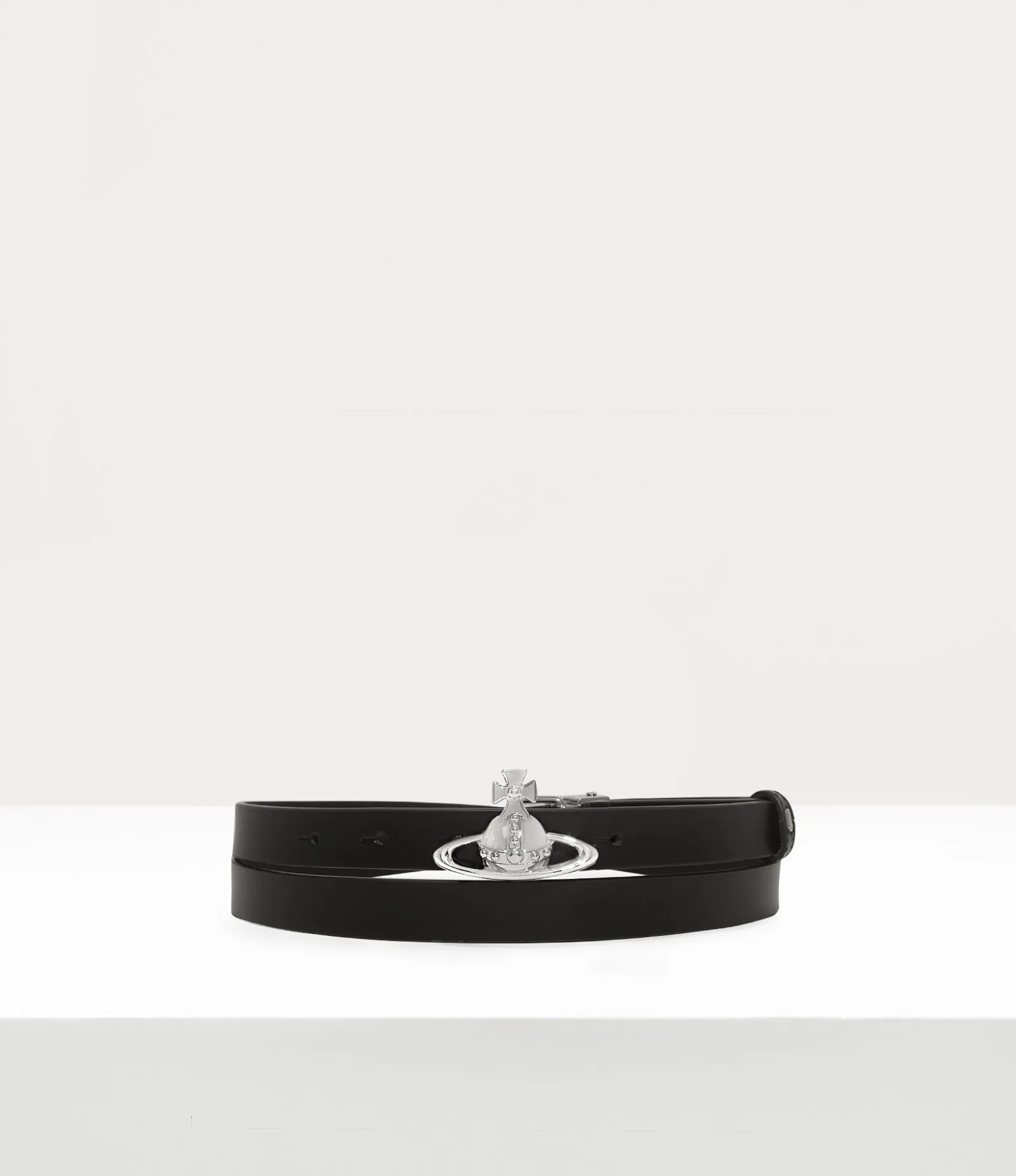 Our Small Orb Buckle belt showcases a buckle closure in a silver-tone finish, accompanied by a slender leather strap adorned with perforated holes along its midsection. The design draws inspiration from our iconic orb logo and receives an all-metal orb clasp – synonymous with Vivienne’s vision of launching tradition into the future.