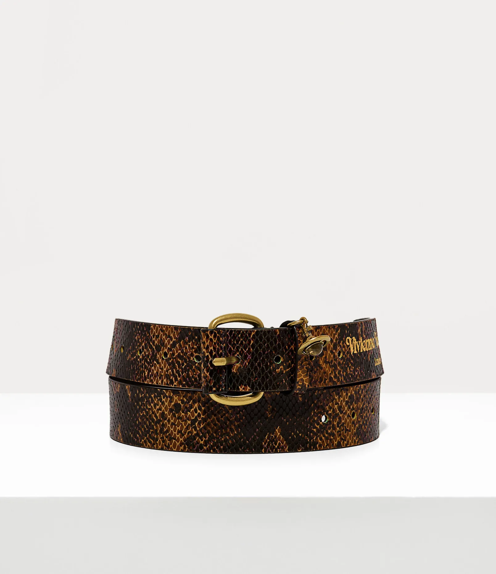 Our Wide Alex Charm belt is a new development of the original ‘Alex belt’, from the Vivienne Westwood archives. This design features the season’s new ‘snakeskin’ pattern, inspired by the dynamic Hammerhead trainers first introduced in the 1982 ‘Savage’ collection. With a roller buckle closure, metal hardware details in a gold-tone finish, and a dangling orb motif at the front, this piece embodies Vivienne’s vision of propelling tradition into the future.