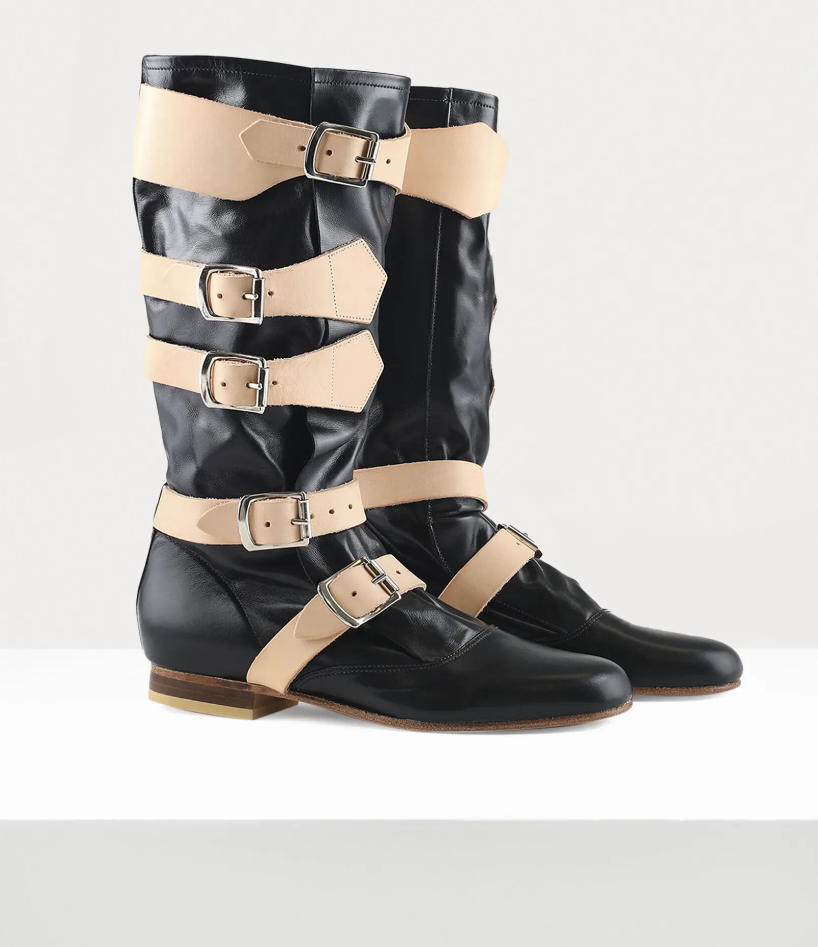 Our Pirate boots were first revealed in the Autumn-Winter 1981 ‘Pirate’ collection, which was influenced by Vivienne’s interest in adventurous pirate stories from the 17th and 18th centuries. The design captures the essence of romanticism and rebellion often linked to pirates, with soft, slouchy leather and oversized buckles that give the boots a rugged, distressed appearance.