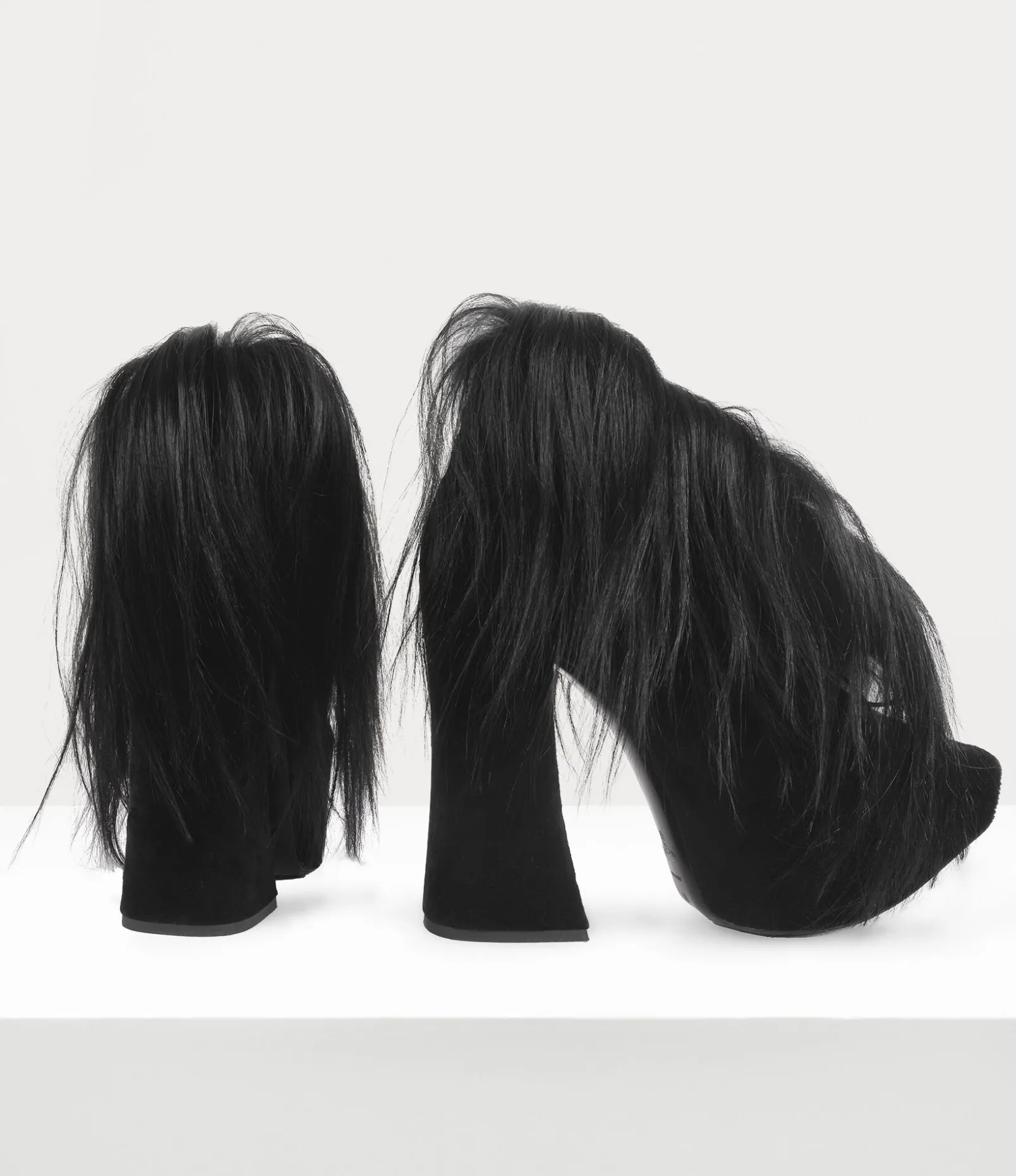 The Scottie boot reimagines an archival Vivienne Westwood design, from the Autumn-Winter ‘Save the Arctic’ collection in 2013-14. The piece features cascading black goat hair, evoking the rugged beauty of the Scottish Highlands, a key inspiration this season. The pointed platform nods to the iconic Mary Jane style, revisited in the Andreas Kronthaler for Vivienne Westwood Autumn-Winter 2023 collection.