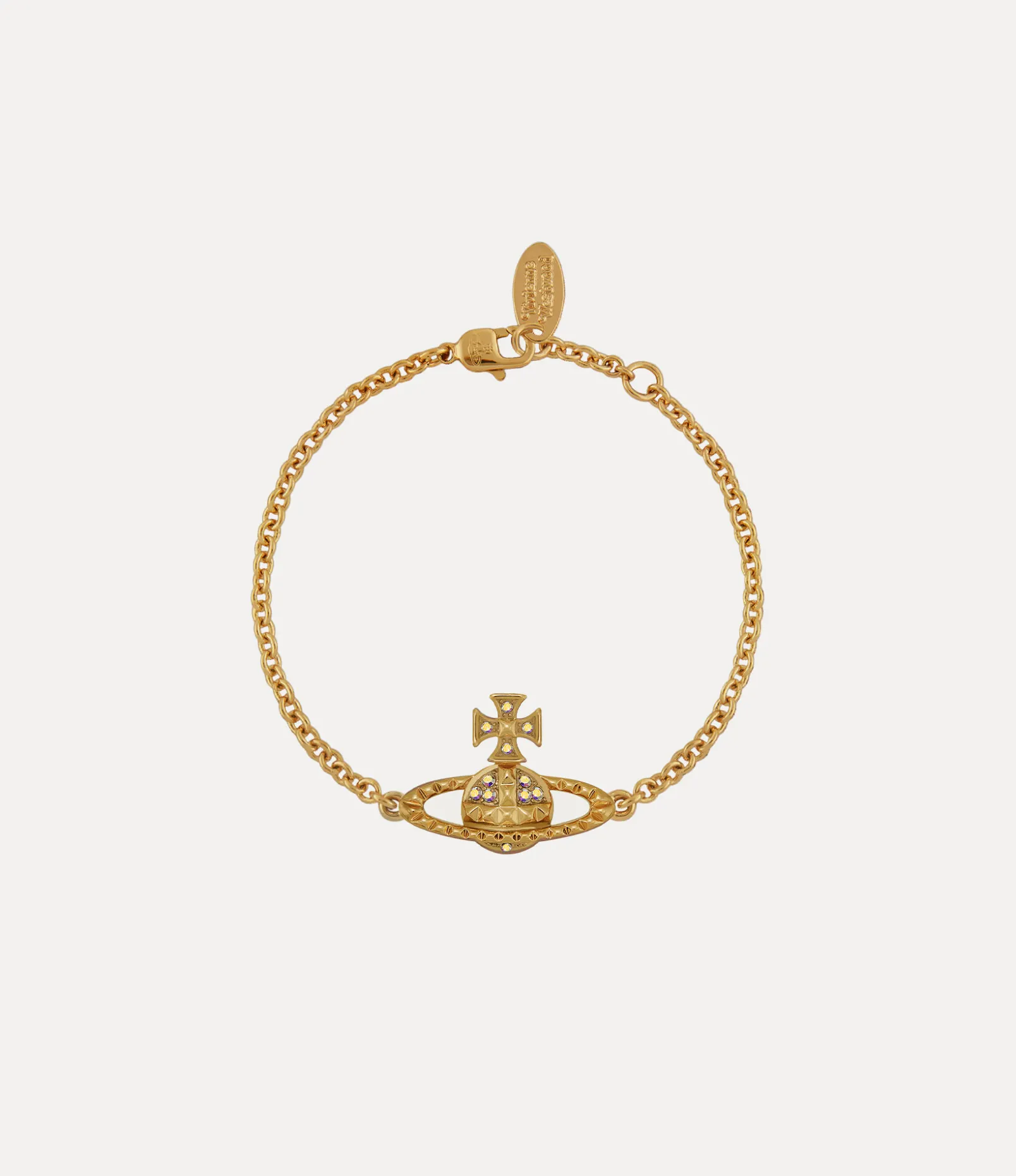 Our Mayfair Bas Relief bracelet has been reimagined this season, with gold-tone plating and iridescent crystal embellishments. The piece is named after the Mayfair district in London which Vivienne was fond of. It features pyramid stud details and our bas relief orb – synonymous with Vivienne’s vision of taking tradition into the future.