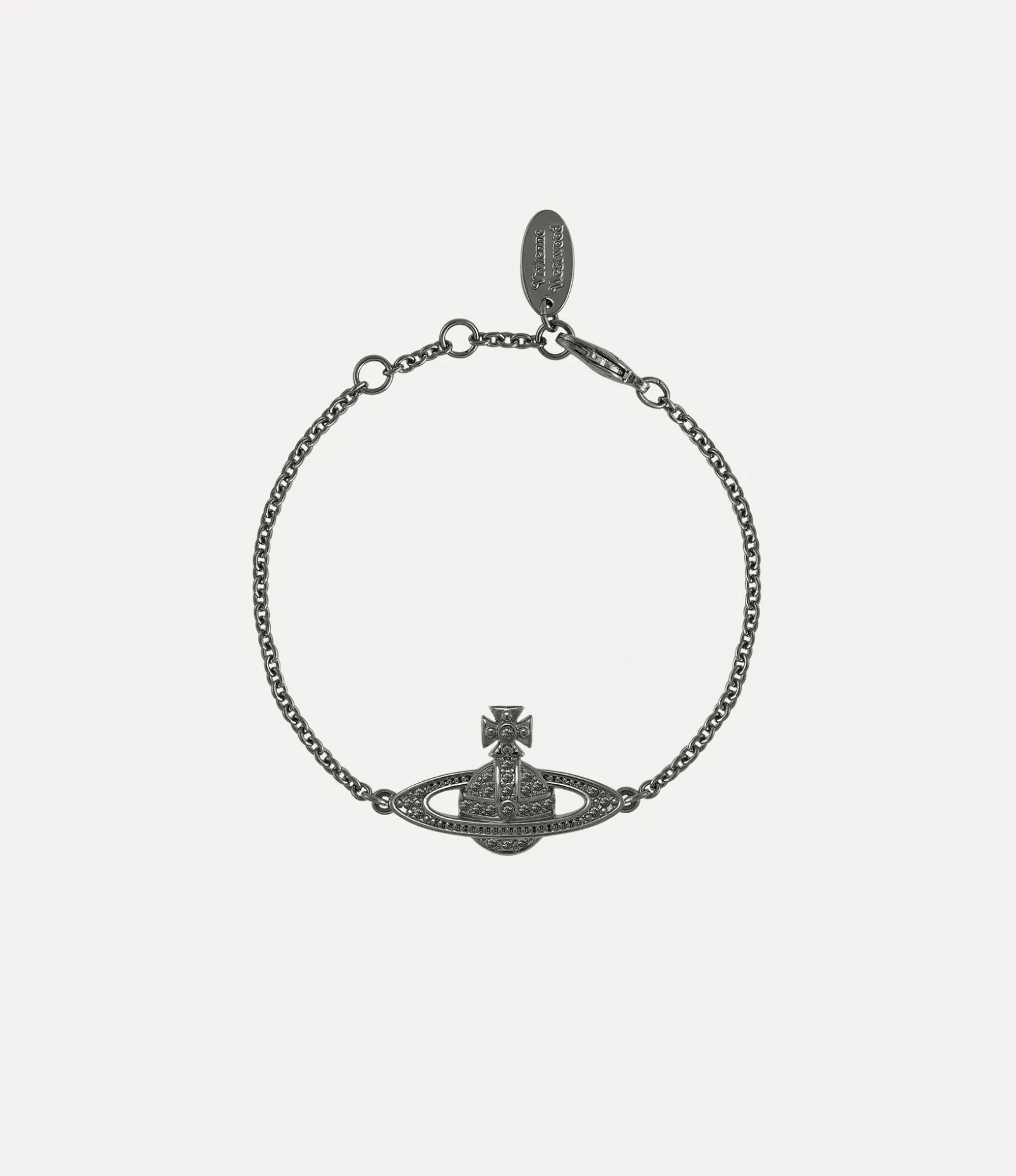 Our Mini Bas Relief Chain bracelet features a two-dimensional orb charm in the centre of the design, a symbol for taking tradition into the future. This season, the piece receives a gunmetal-tone finish and glistening pave-set gemstone details.