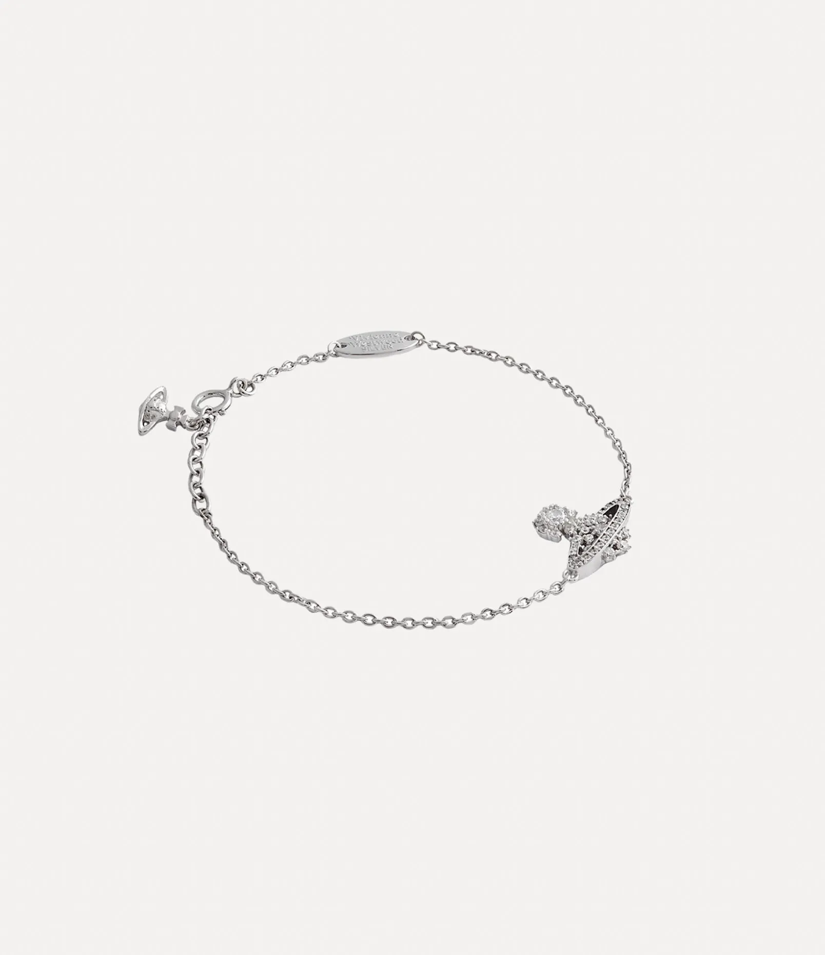 Our Narcissa bracelet features a platinum-plated silver finish, complete with weblike crystal embellishments that draw inspiration from intricate lacework detailing from the Vivienne Westwood archives. The piece receives an orb motif in the centre, synonymous with Vivienne’s vision of launching tradition into the future.