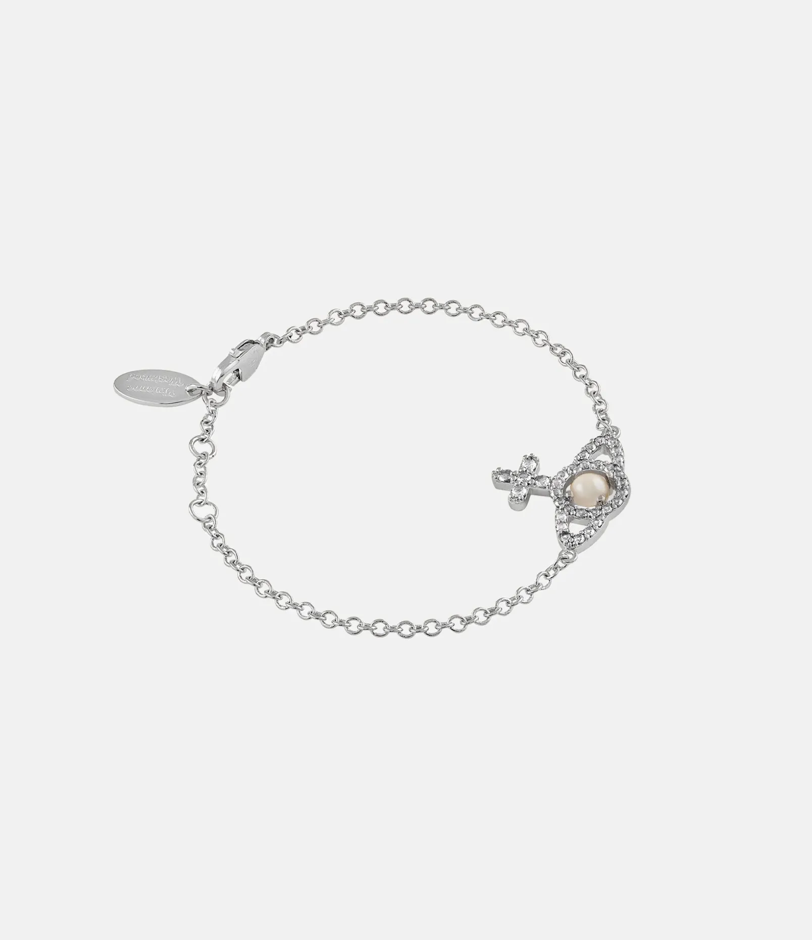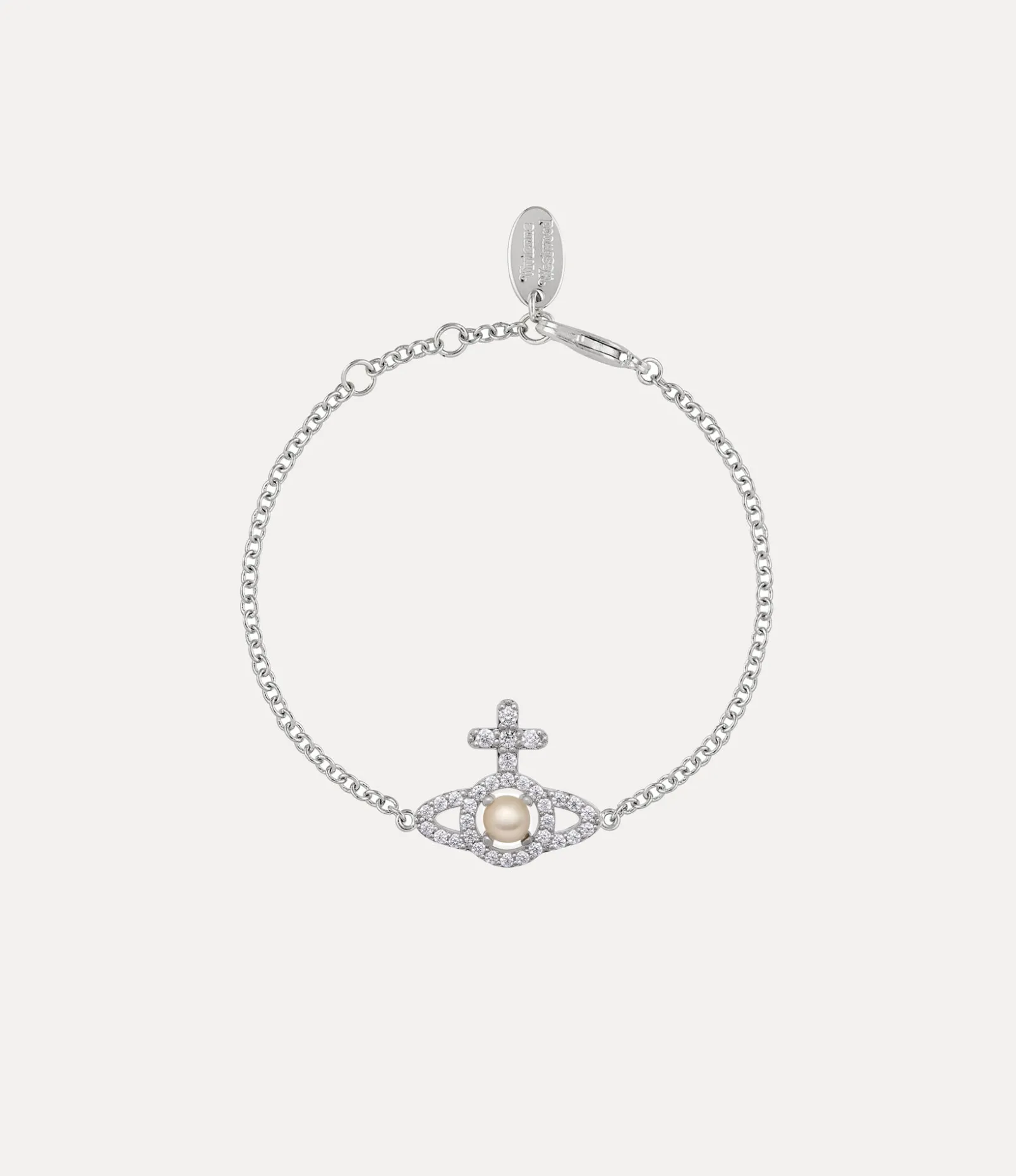 The orb charm featured in the Olympia Pearl Chain bracelet embodies Vivienne’s vision of taking tradition into the future. The iconic orb design is accentuated with white crystal details, complemented by a glistening glass-based pearl at the centre of the piece.