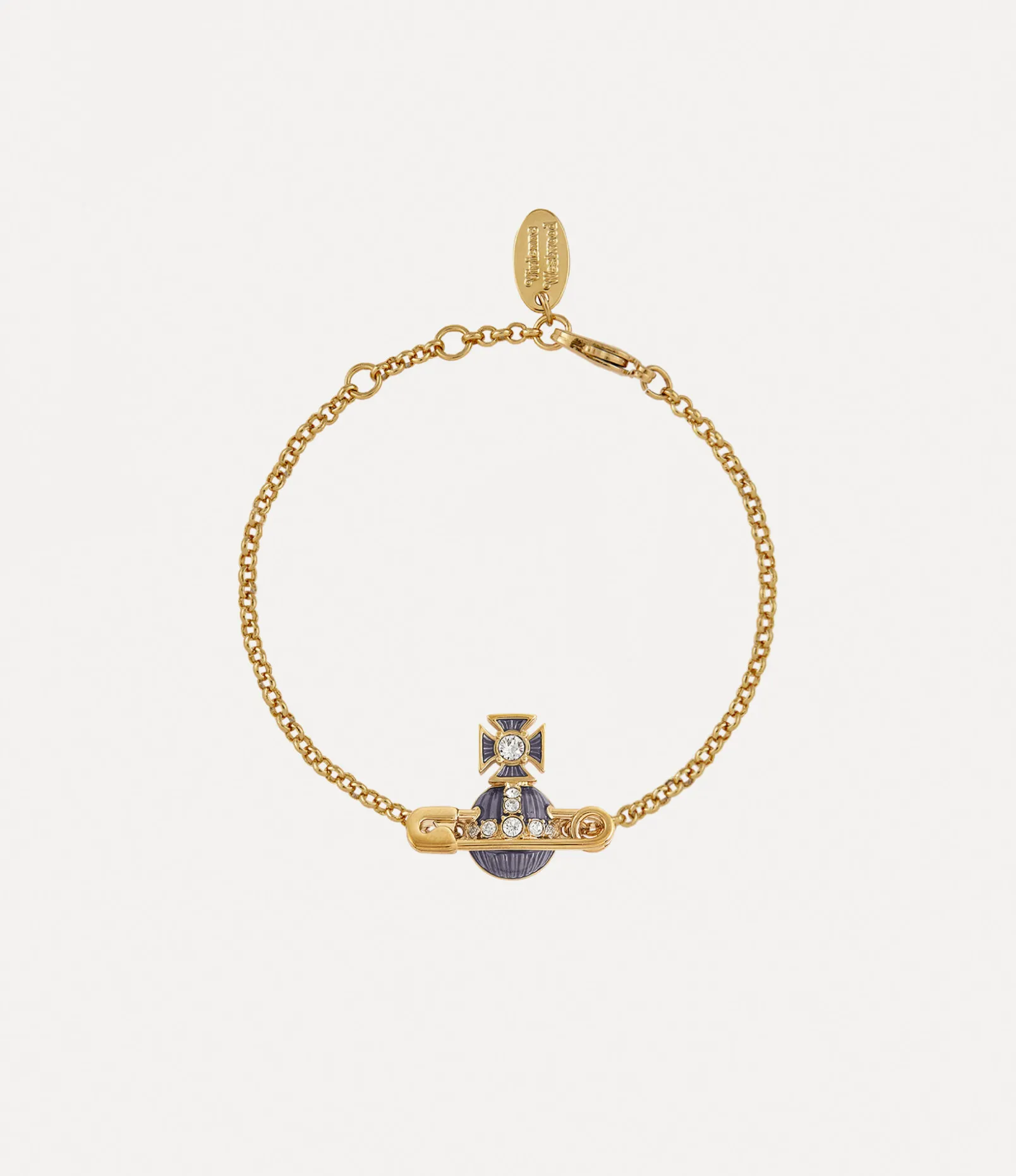 The timeless safety pin motif has become integral to our house’s iconography, evoking a sense of non-conformity, reminiscent of Vivienne’s signature punk approach. This season’s Kitty bracelet revives this motif with gold-tone plating, complete with translucent violet enamel detailing.