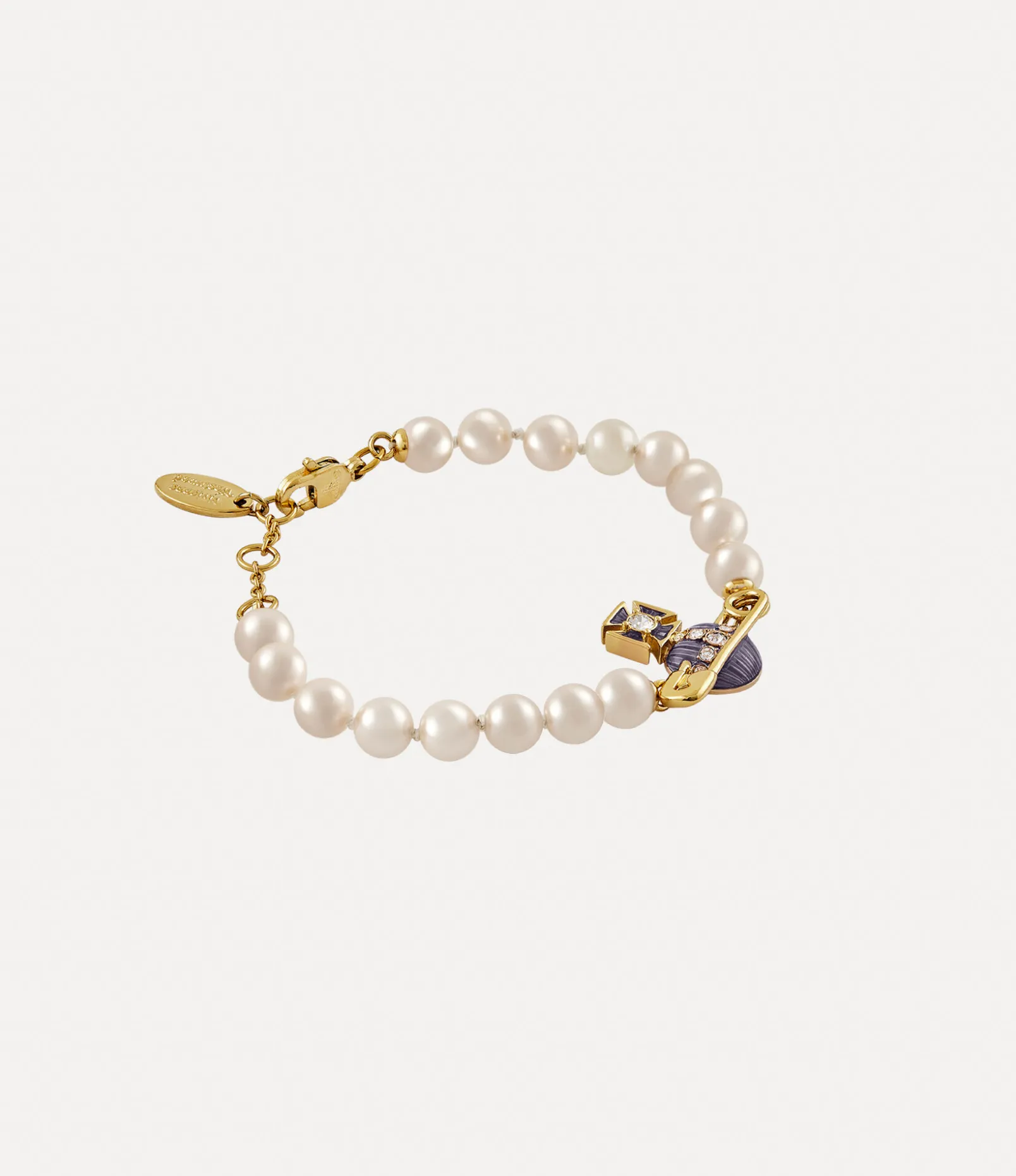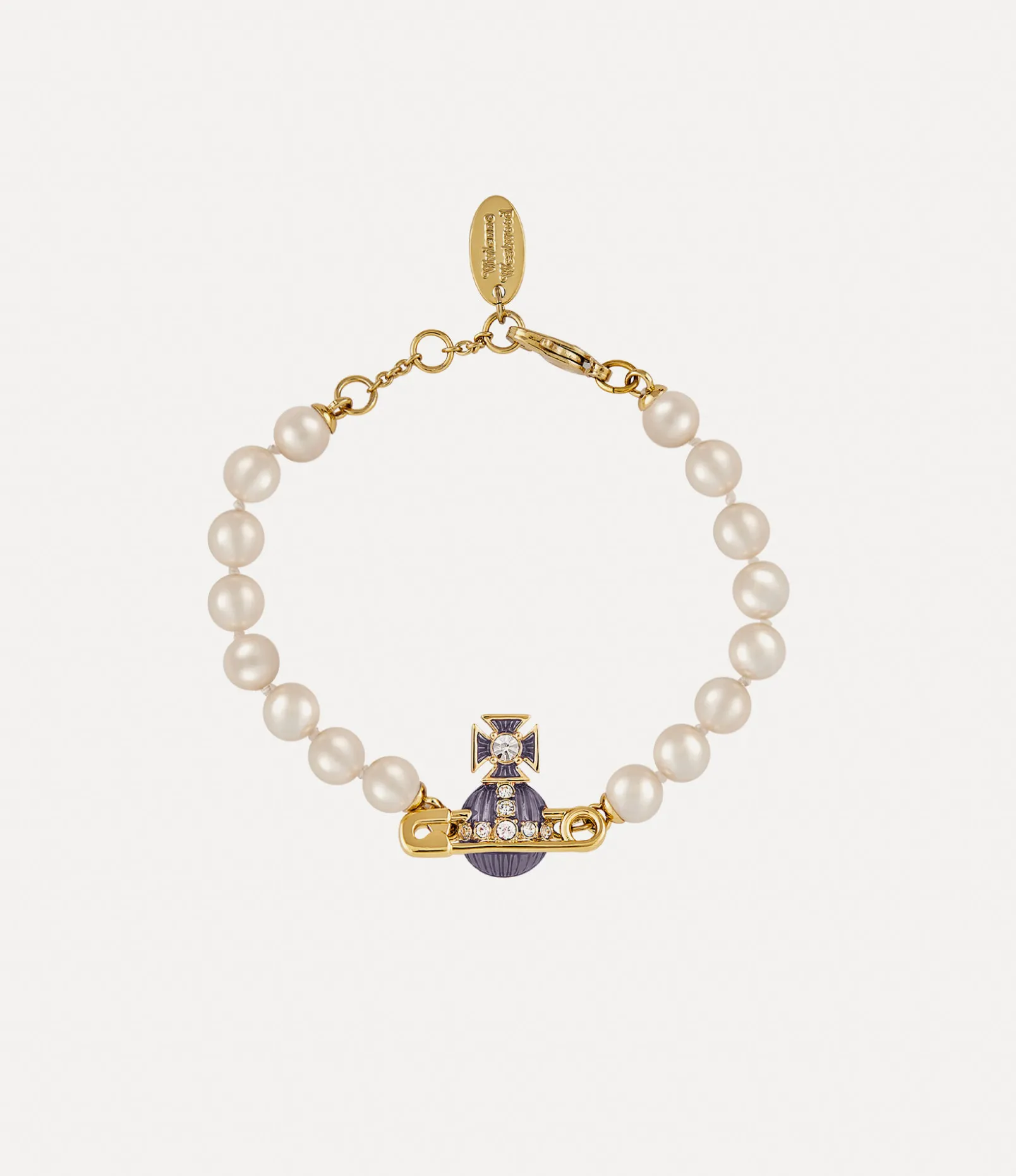 The Kitty Pearl bracelet features hand-knotted glass-based pearls inspired by Vivienne Westwood’s 1990 ‘Portrait’ collection. Our iconic orb silhouette features a safety pin motif and is hand-painted with translucent violet enamel, revealing an intricate metal pattern beneath.