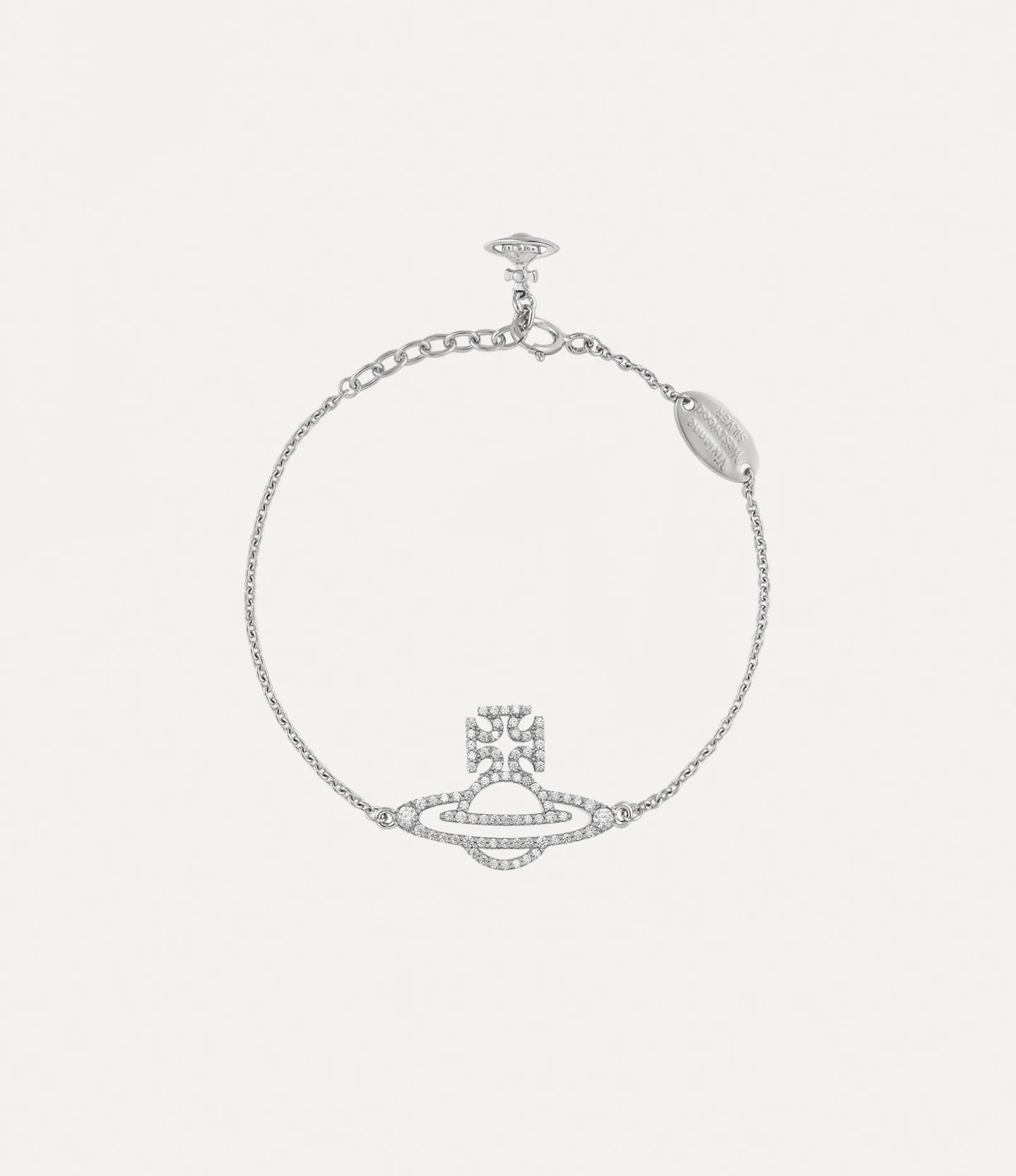 Our Trudy bracelet revives our classic orb motif, reminiscent of Vivienne’s vision of launching tradition into the future. The design is adorned with pavé-set crystals and features a dangling orb charm at the clasp, all elegantly finished with a fine link chain.