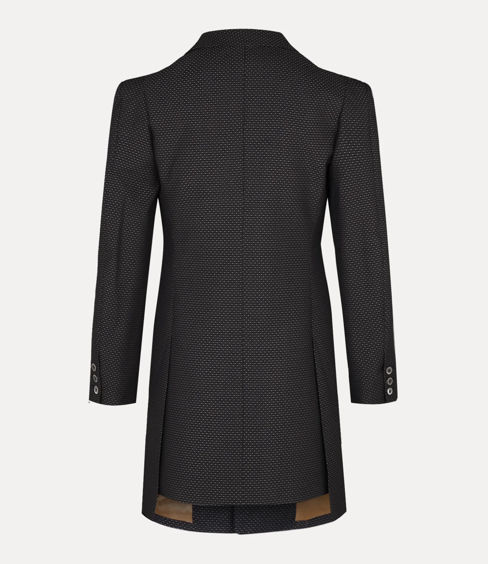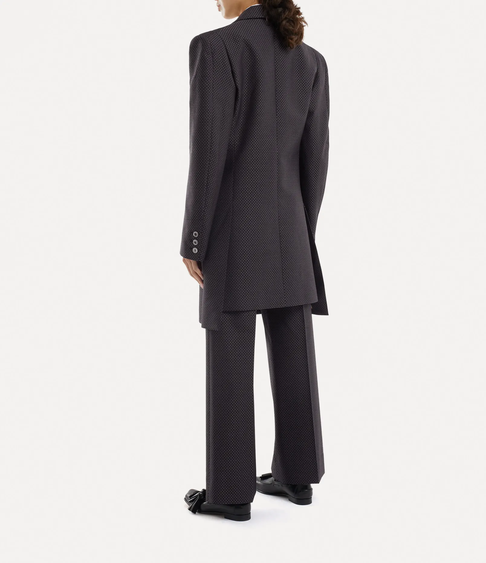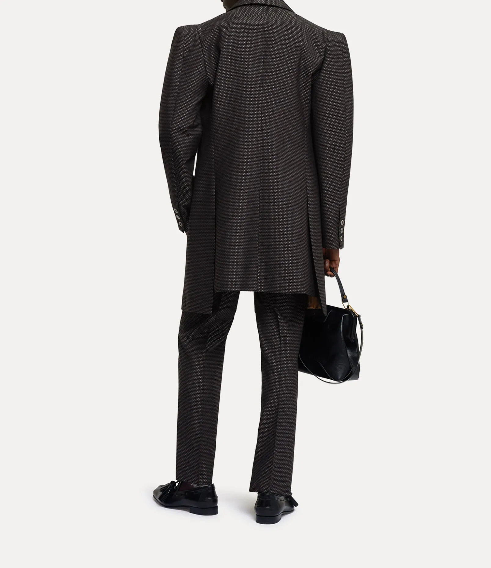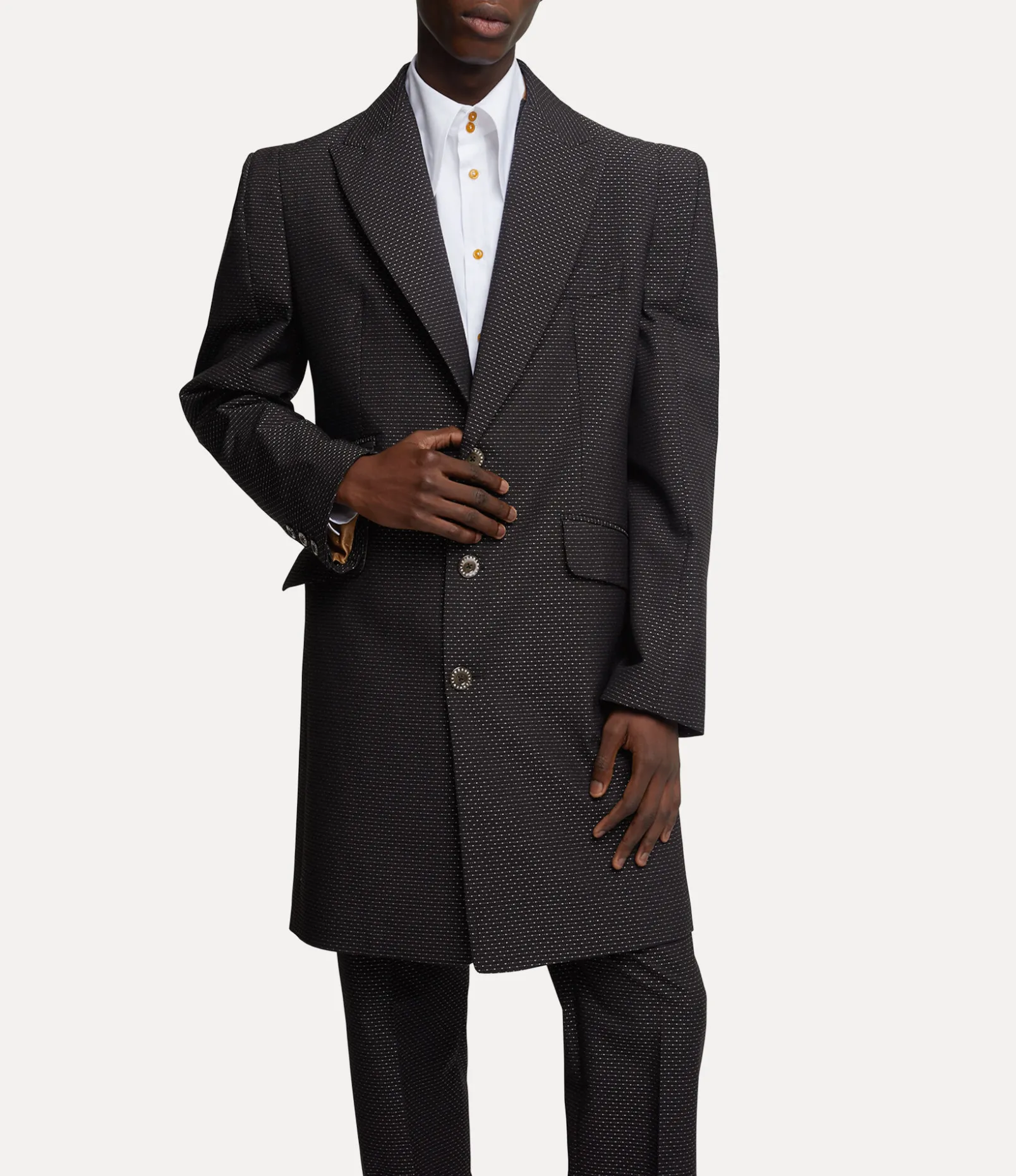 Our Alien three-button coat features Vivienne’s archival ‘Alien sleeve’ construction to add structure and size to the shoulders. The design receives this season’s ‘wool raindrop’ fabric, featuring small, elongated shapes scattered across the fabric, mimicking the appearance of falling raindrops.