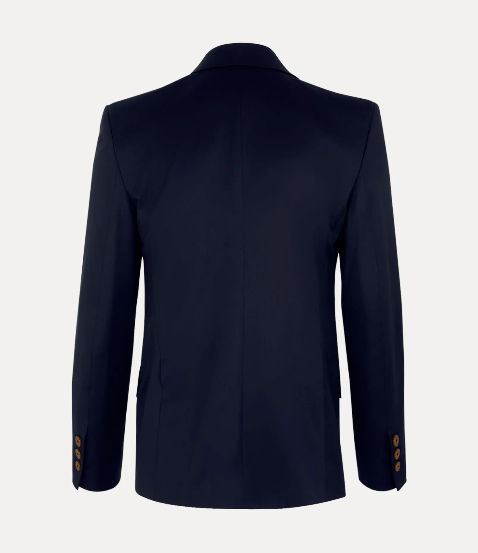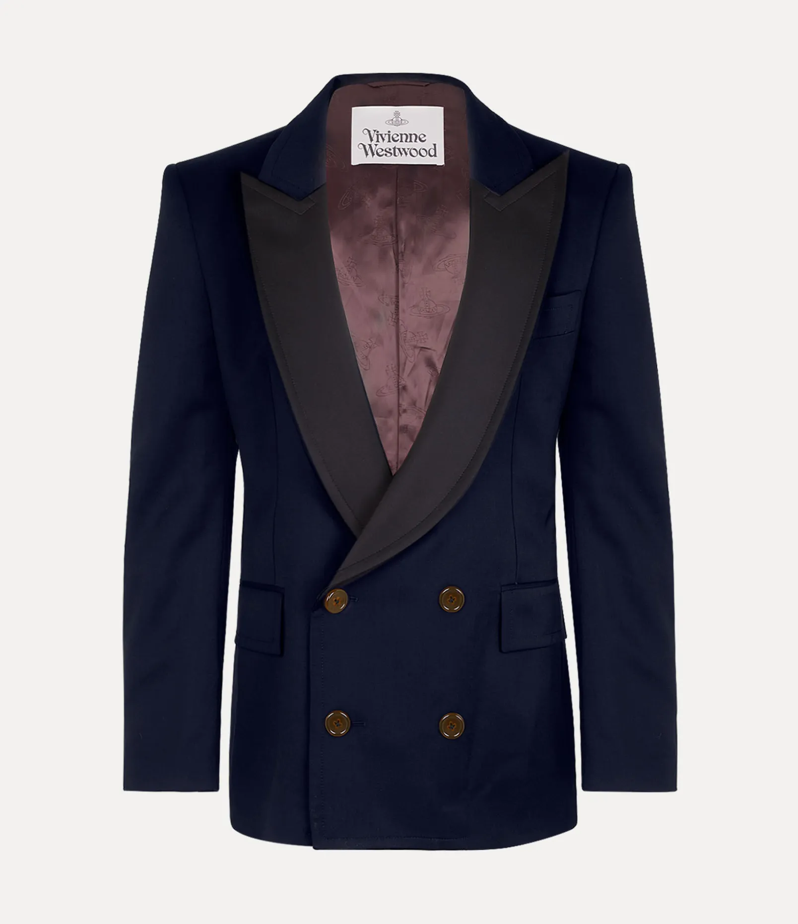 Our woollen Horseshoe jacket adopts a newly developed silhouette this season, featuring a U-shaped neckline with a double-breasted finish, complete with peaked lapels in a contrasting fabric. The piece receives an orb jacquard lining – synonymous with Vivienne’s vision of launching tradition into the future.