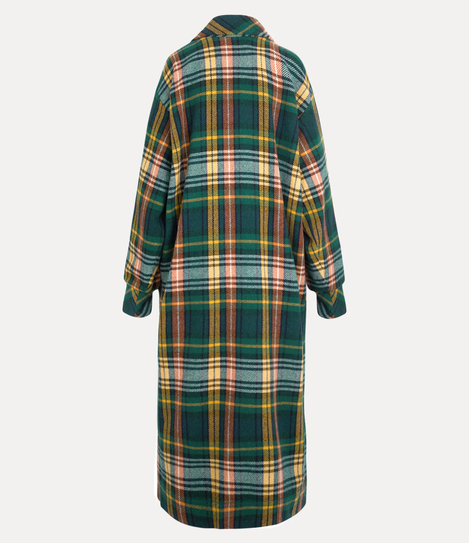 Our Karl coat features a woollen tartan motif woven across the design, reminiscent of an archival tartan fabric seen in the Vivienne Westwood Autumn-Winter 1993 ‘Anglomania’ collection. The piece adopts a partially lined interior with contrasting stripes, artfully clashing with the tartan exterior to reflect this season’s Highland inspiration.