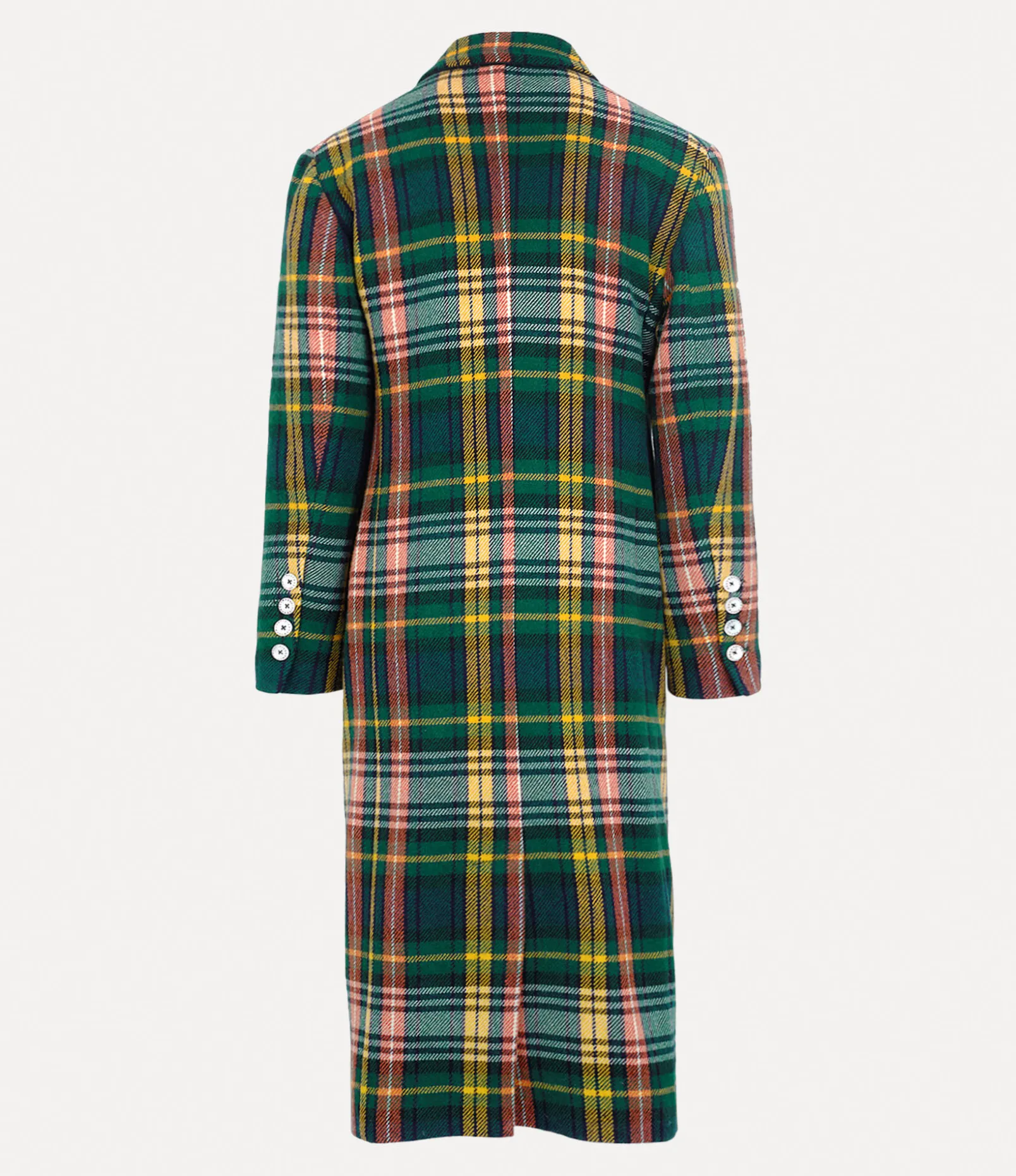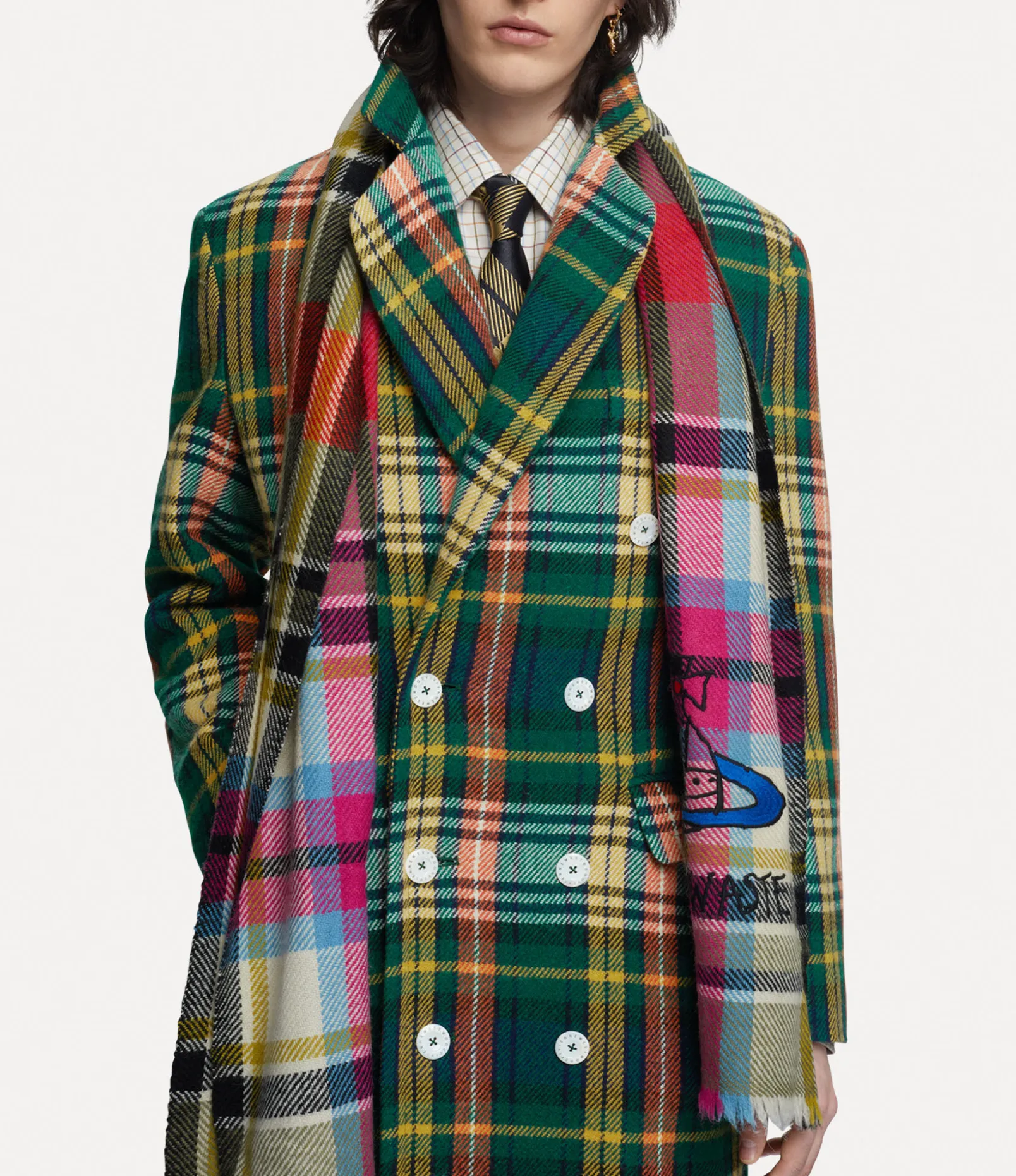 The Man Long Wreck coat, with its double-breasted design, has become a signature style for the house and has been featured in numerous collections over the years. This season, the coat is embellished with a woolen tartan pattern woven into the fabric, reminiscent of a tartan fabric from the Vivienne Westwood Autumn-Winter 1993 ‘Anglomania’ collection.