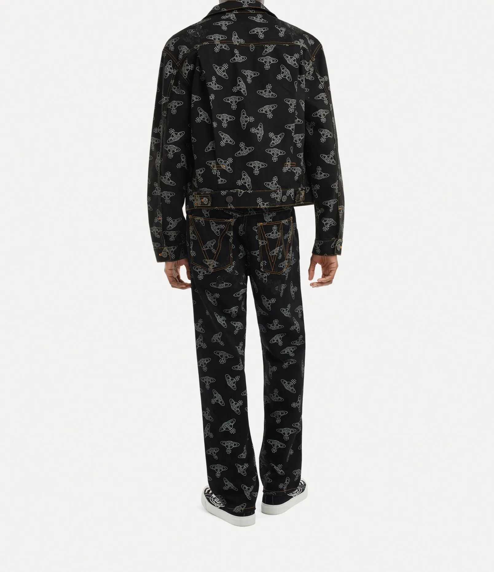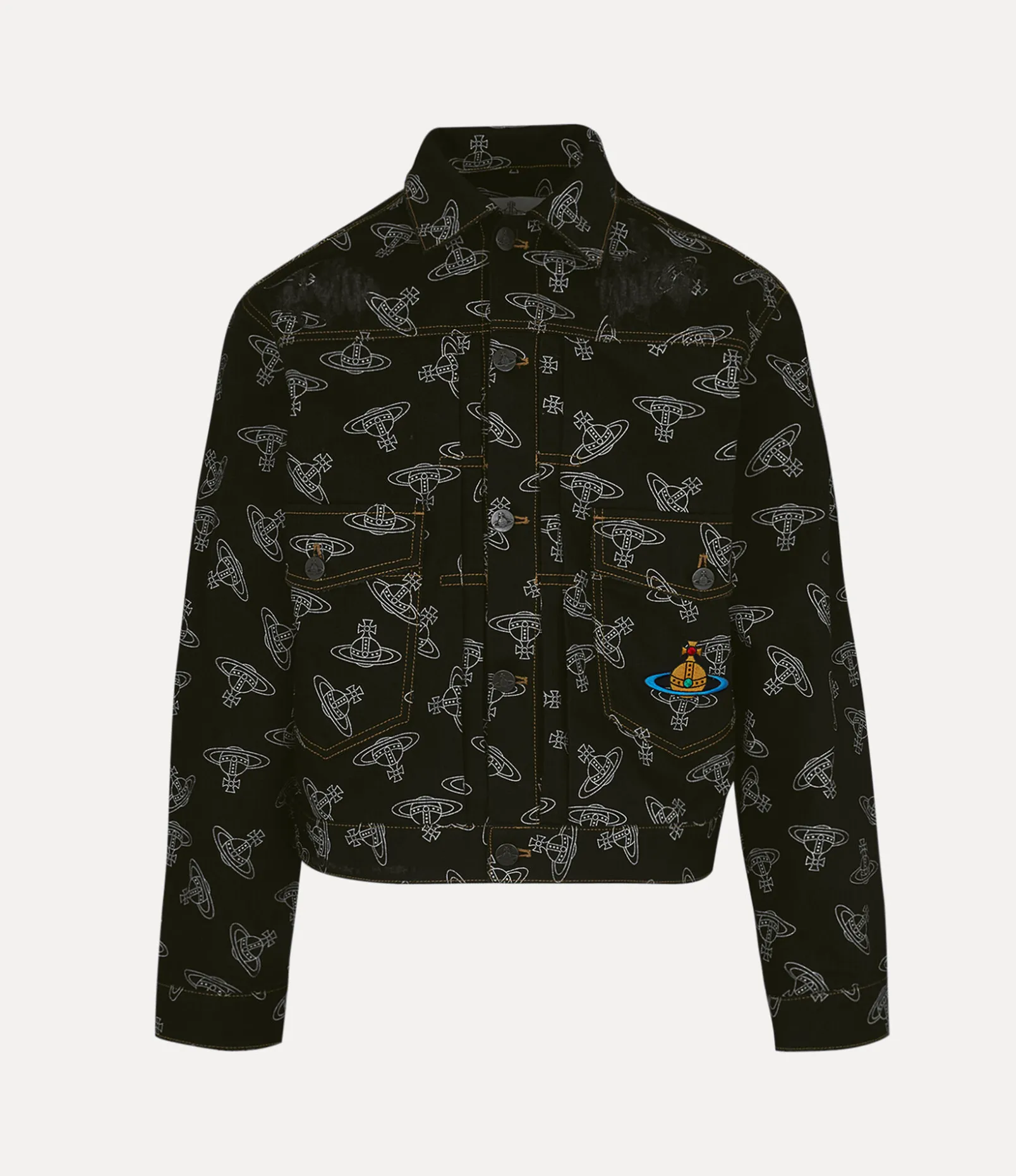 Our signature Marlene jacket receives the house’s ‘Tossed Orb’ jacquard across the design, showcasing a repeated orb pattern in a contrasting white-coloured finish. The piece features a multicoloured orb embroidered on the front pocket, synonymous with Vivienne’s vision of taking tradition into the future.