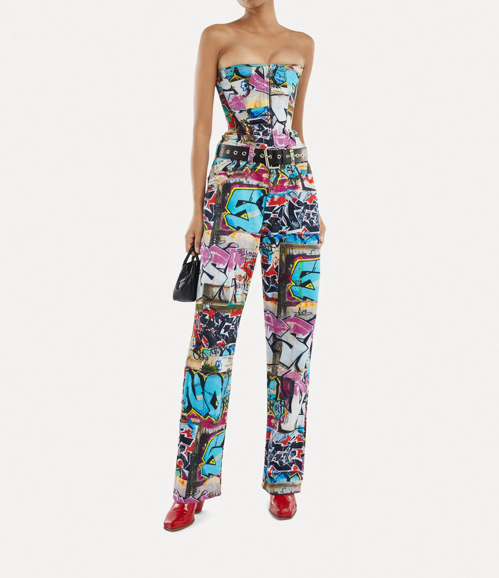 The silhouette of the Denim Cobrax corset reveals how Vivienne originally subverted the classic corset structure, worn by high society women of eighteenth-century salon culture. The design revives our archival graffiti jacquard, first seen in the Vivienne Westwood Autumn-Winter 2020-21 Paris show, reminiscent of the house’s signature punk style.