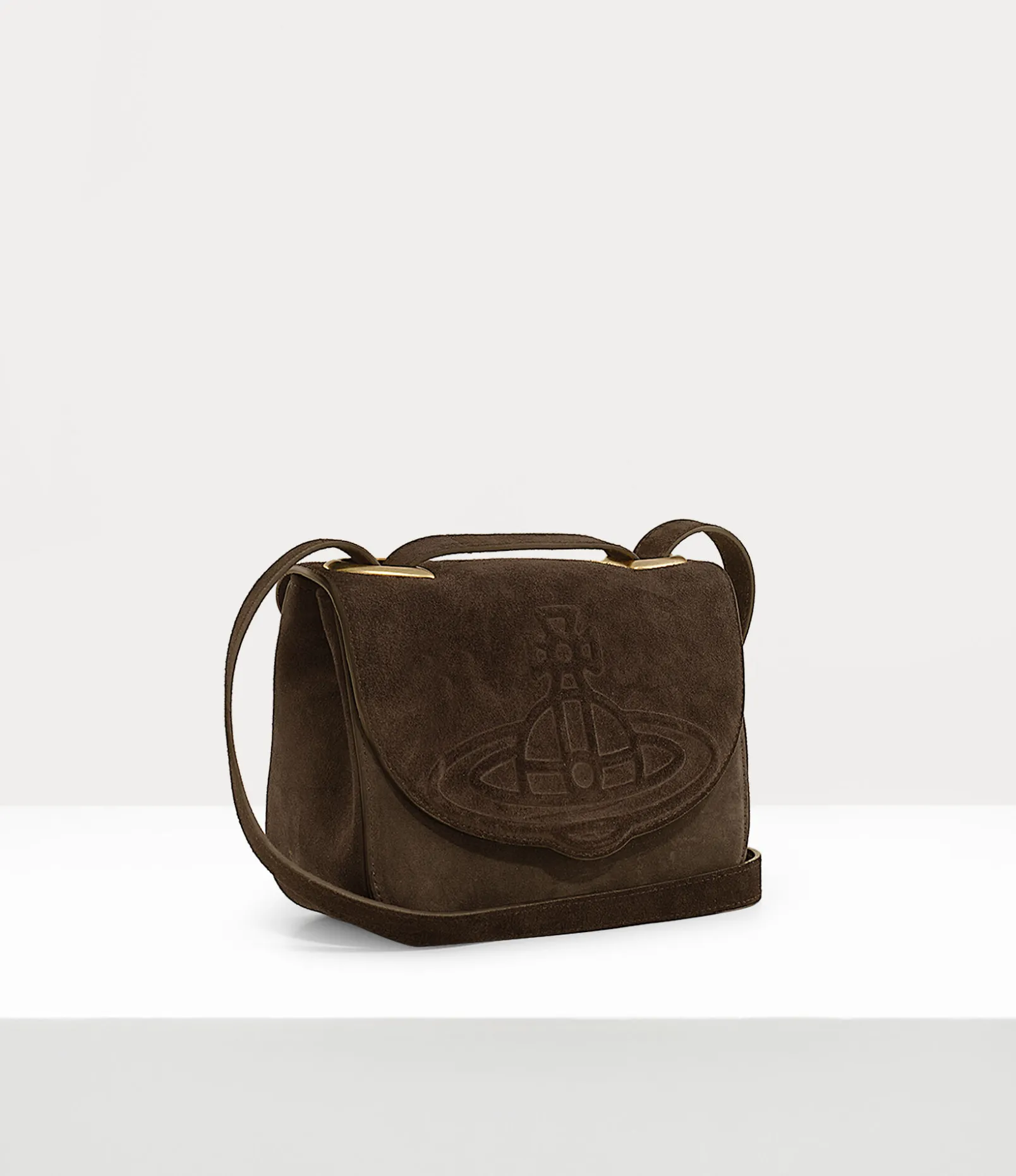 Our Linda Crossbody bag has been reimagined in this season’s soft suede fabric, adorned with the new metal hardware, complete with a gold-tone finish. As part of our new range, the piece receives an injected orb motif on the front flap, synonymous with Vivienne’s vision of launching tradition into the future.