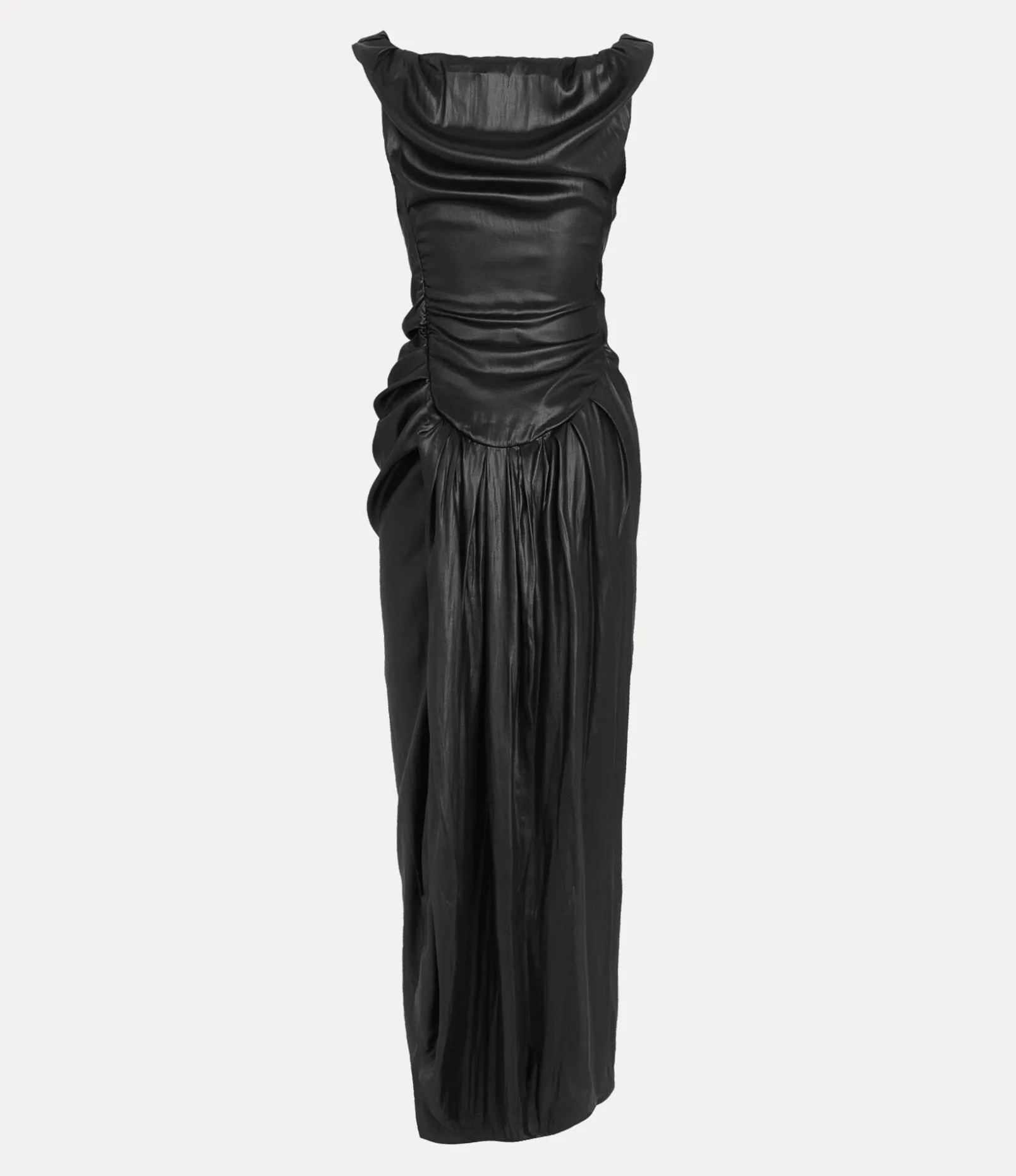- Drape detailing at the neck and waist