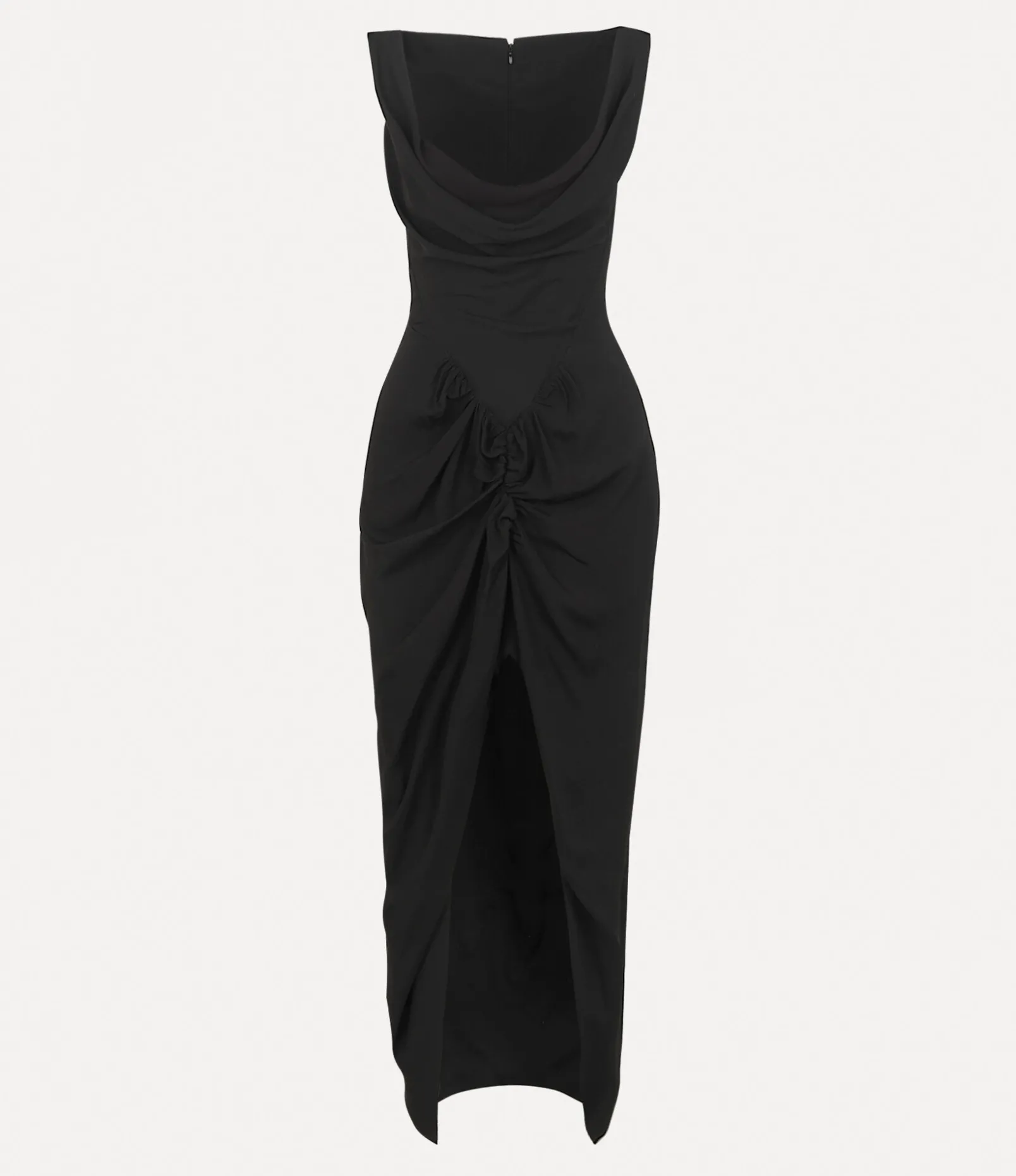 Our ‘Panther’ tailoring system, developed by Andreas Kronthaler, is showcased in our viscose Long Panther dress. This signature silhouette is secured with an invisible zip fastening at the back and features a classic scoop neckline and an asymmetrically gathered skirt, signature to Vivienne Westwood’s designs.