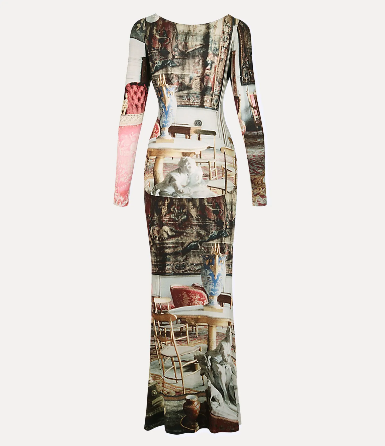 This season’s Salon dress revives our archive ‘Salon’ artwork, initially presented in the Vivienne Westwood 1992 ‘Salon’ collection. The motif captures the opulent ambience of an 18th-century salon, reminiscent of the grandeur of the ‘Empire Style’ trend – where classical shapes merge with the extravagance of Imperial Rome.