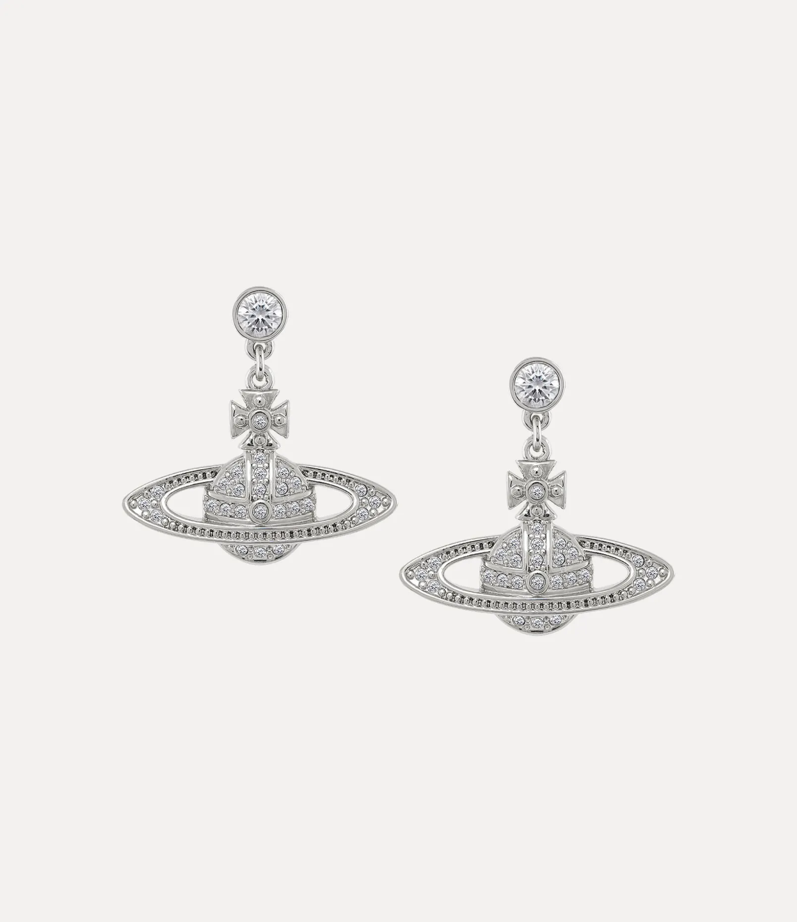 The orb silhouette has long been synonymous with the house, recalling Vivienne’s vision of launching tradition into the future. The Mini Bas Relief Drop earrings receive an orb shape, complete with polished platinum-tone plating and white crystal details to finish.