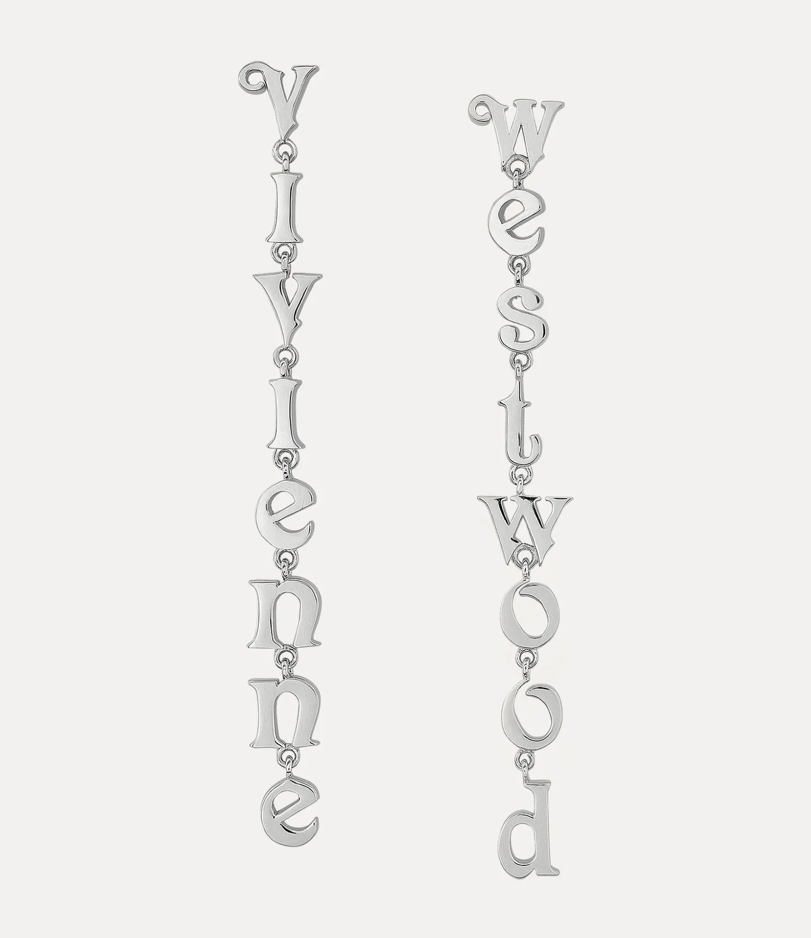 The asymmetric Raimunda earrings showcase the words ‘Vivienne’ and ‘Westwood’ sculpted in our classic lettering, enhanced by silver-toned plating. Dangling gracefully from the lobe, these earrings are secured with a post-back closure and feature a drop silhouette.