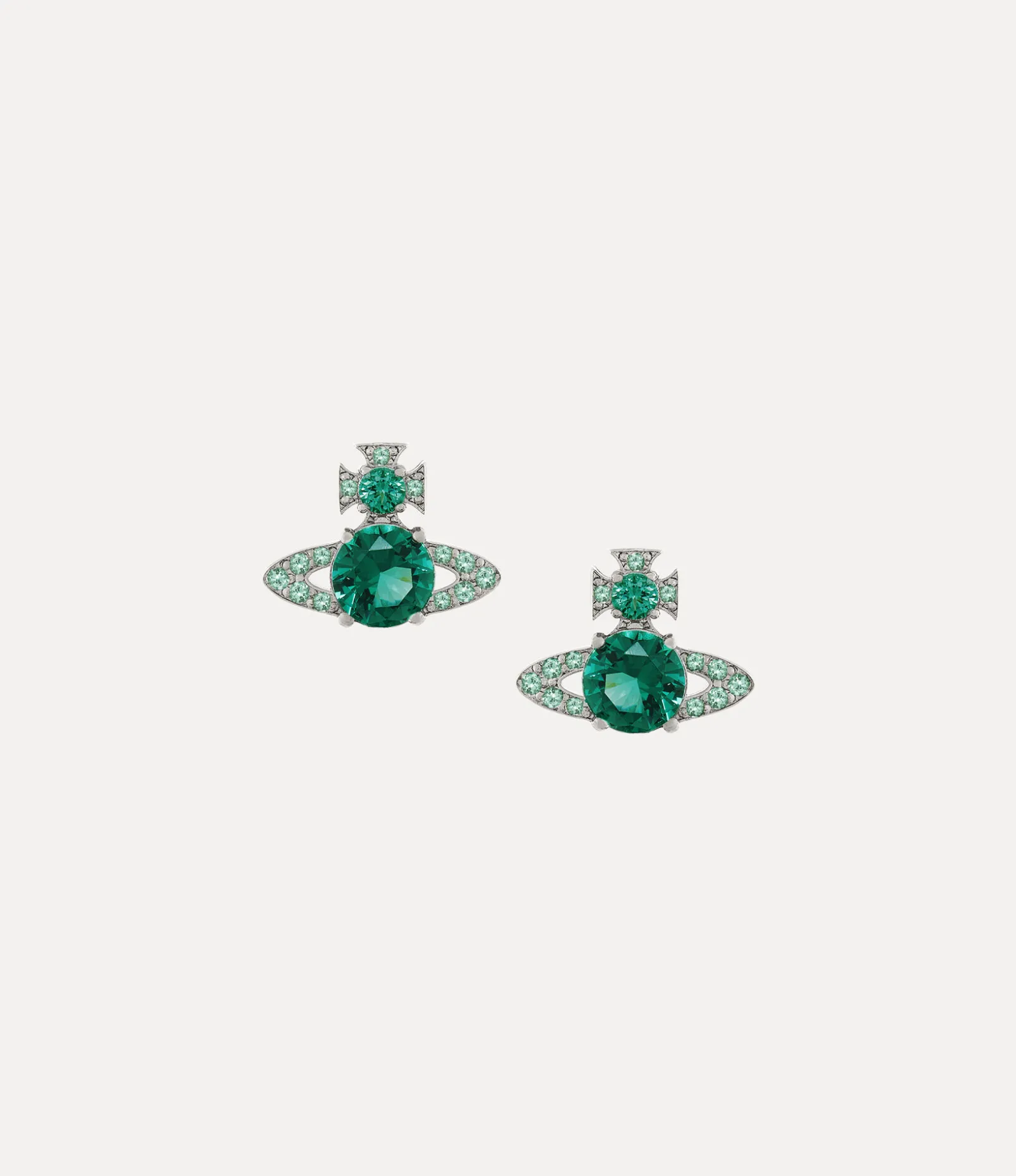 Our Ismene earrings return this season, featuring a polished platinum-tone finish and dark green crystal accents. The orb silhouette draws inspiration from our house’s signature orb motif – synonymous with Vivienne’s vision of launching tradition into the future.