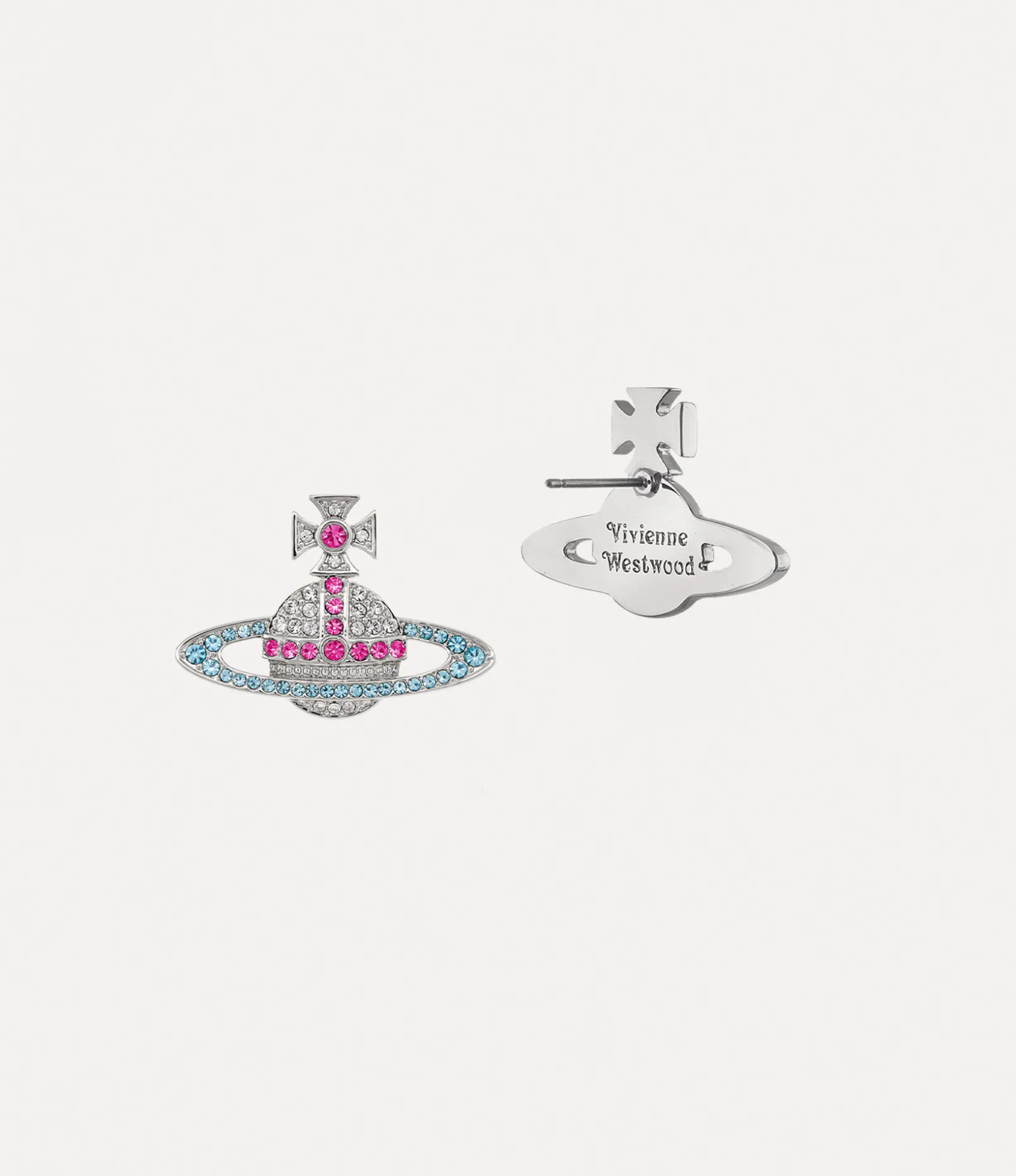 The Kika earrings feature a silver-tone construction and an orb-shaped silhouette that is encrusted with a mix of white and fuchsia crystals. The earrings are engraved with the words ‘Vivienne Westwood’ at the back of the metal frame, underneath the custom butterfly-back fastenings.