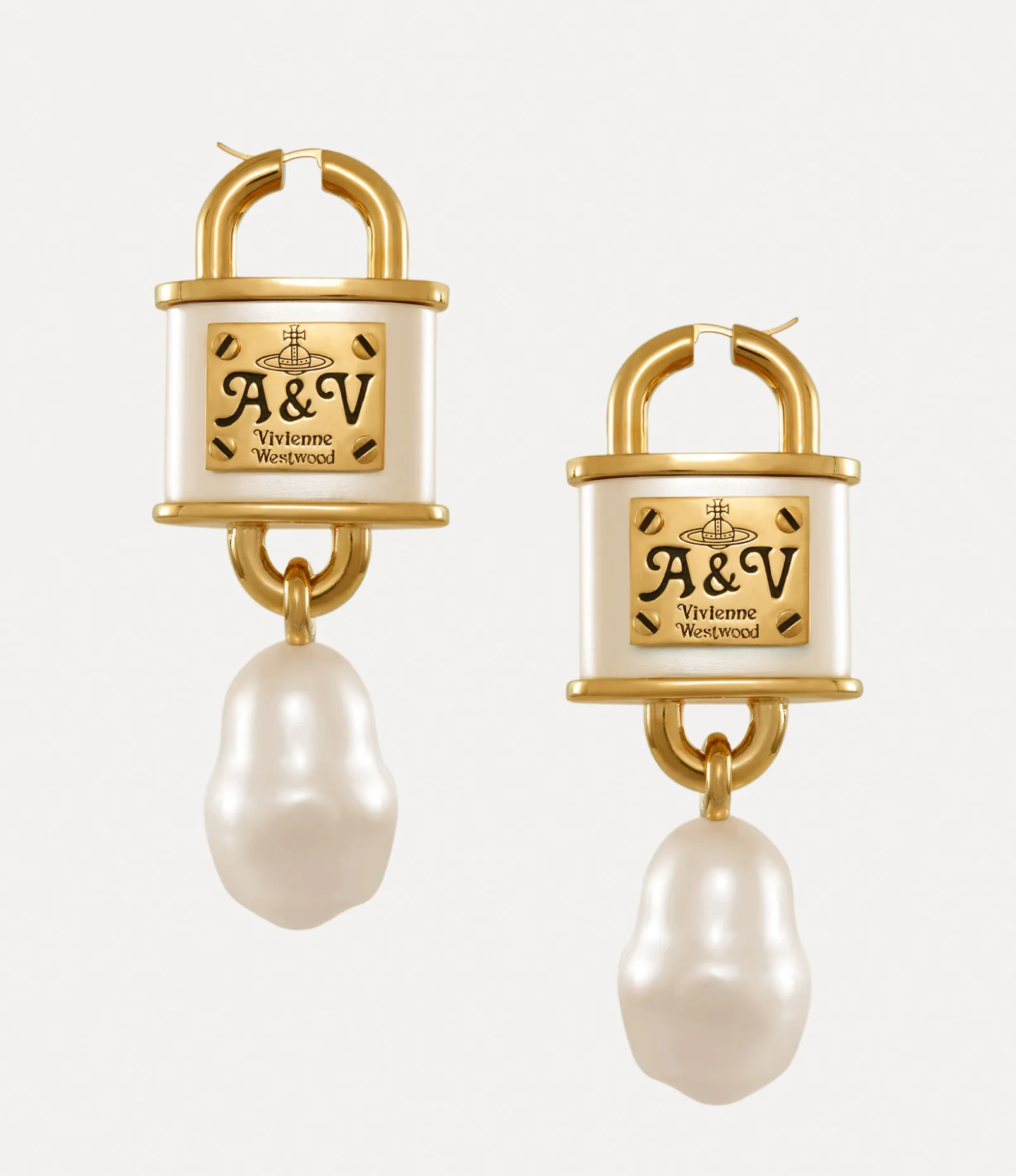 The padlock shape has become a signature style of the house, having appeared in many collections throughout our history. The silhouette of the Posy earrings revives the motif, complete with chunky hardware and a pearl-coated dangle detail, evoking Vivienne’s signature punk aesthetic.