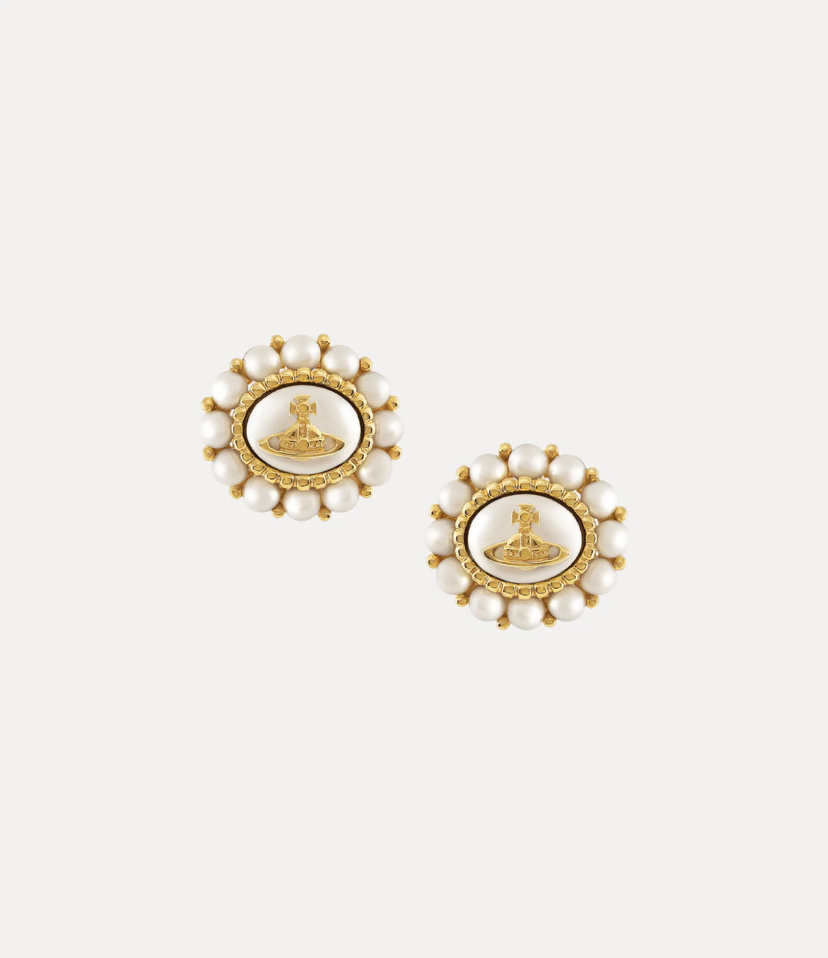 Pearls are an essential part of our house’s heritage, emulating a sense of bygone luxury. The Small Amaya earrings adopt a halo of glass-based pearls in a glistening white finish, complete with gold-tone brass plating. The piece receives an orb plaque in the centre of the design, a symbol of Vivienne’s vision of launching tradition into the future.