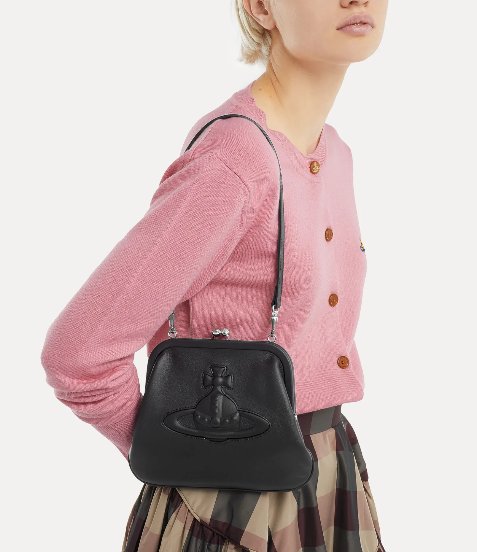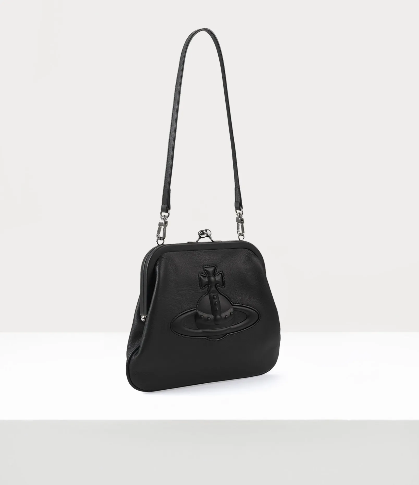 The Vivienne’s clutch in smooth leather pays homage to the houses founder. This classic style features a vintage-like kiss-lock frame and injected orb on the front panel, inspired by Vivienne Westwood’s orb-shaped logo, a symbol for launching tradition into the future.