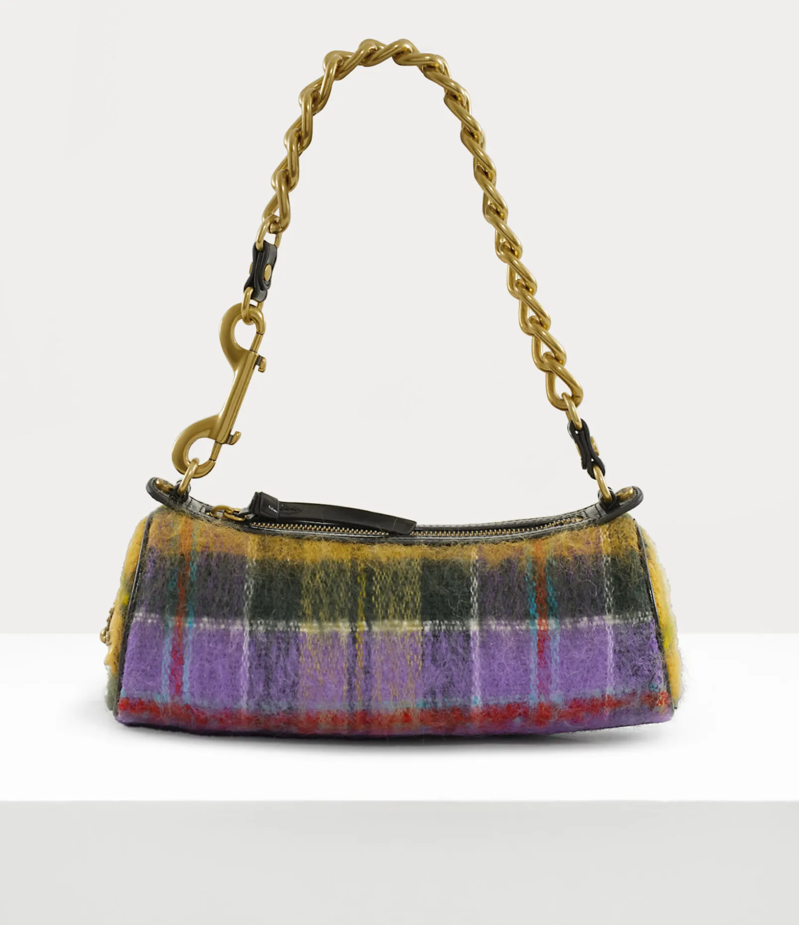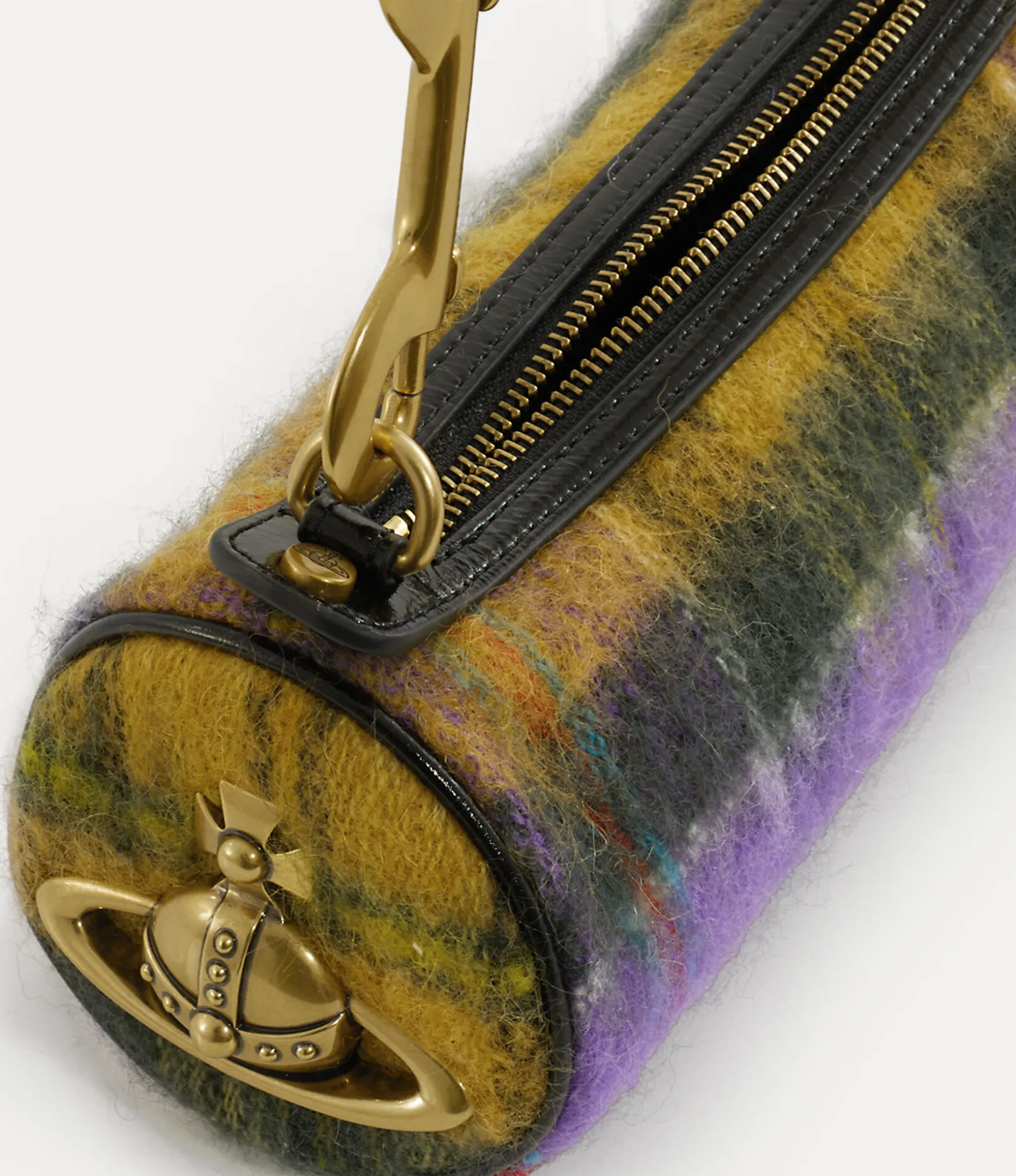 Our signature Cindy Cylinder bag is reimagined this season, drawing inspiration from the Vivienne Westwood Autumn-Winter 1985-86 ‘Mini-Crini’ collection. This updated design showcases our signature orb motif on the gusset, complete with a tartan mohair fabric, capturing the essence of Scotland’s rugged landscape of Scotland, created using a brushed effect technique.