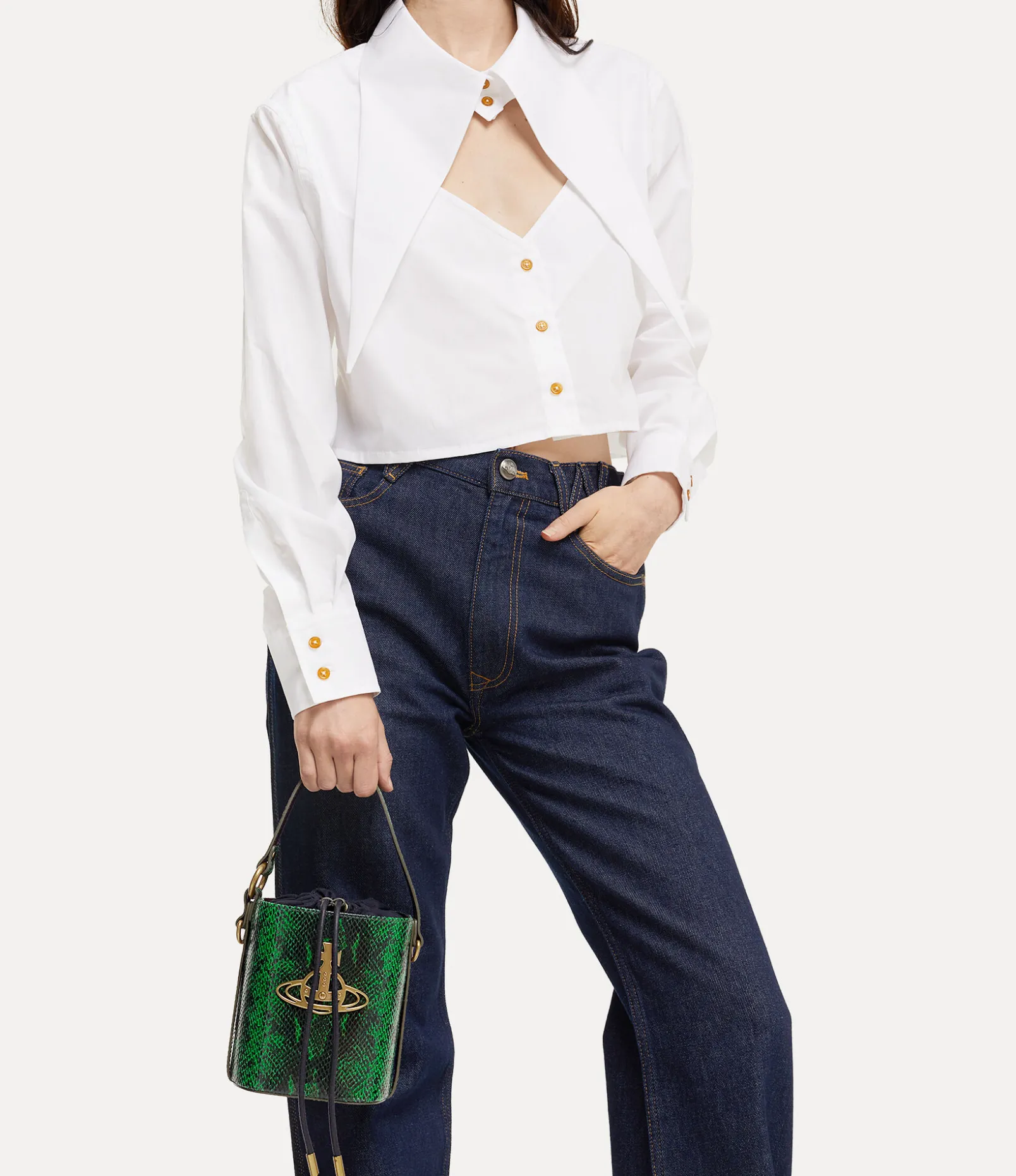 Our Daisy Drawstring Bucket bag receives a python-embossed motif, complete with a drawstring closure. The interior lining features the archive ‘Broken Pinstripe’ lining, which was first introduced in the Autumn-Winter 1993 Anglomania collection, while the line orb plaque on the front panel alludes to Vivienne’s vision for taking tradition into the future.