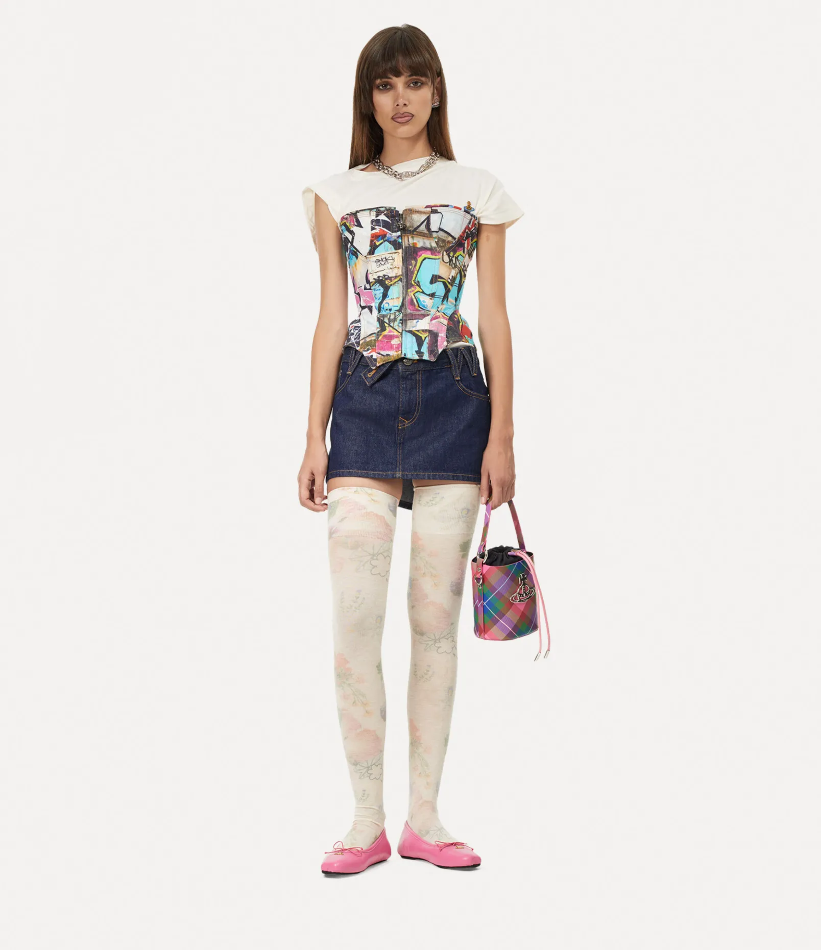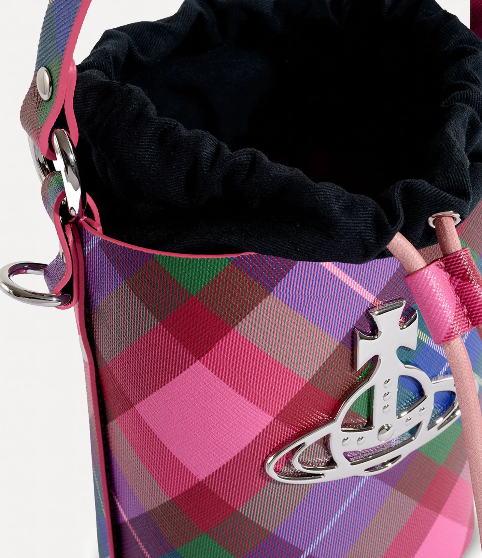 This season, our Daisy Drawstring Bucket bag features the house’s ‘candy tartan’ motif, complete with playful, candy-toned hues. The piece is adorned with a drawstring closure, finished with a polished, silver-tone orb plaque on the front panel—alluding to Vivienne’s vision for taking tradition into the future.