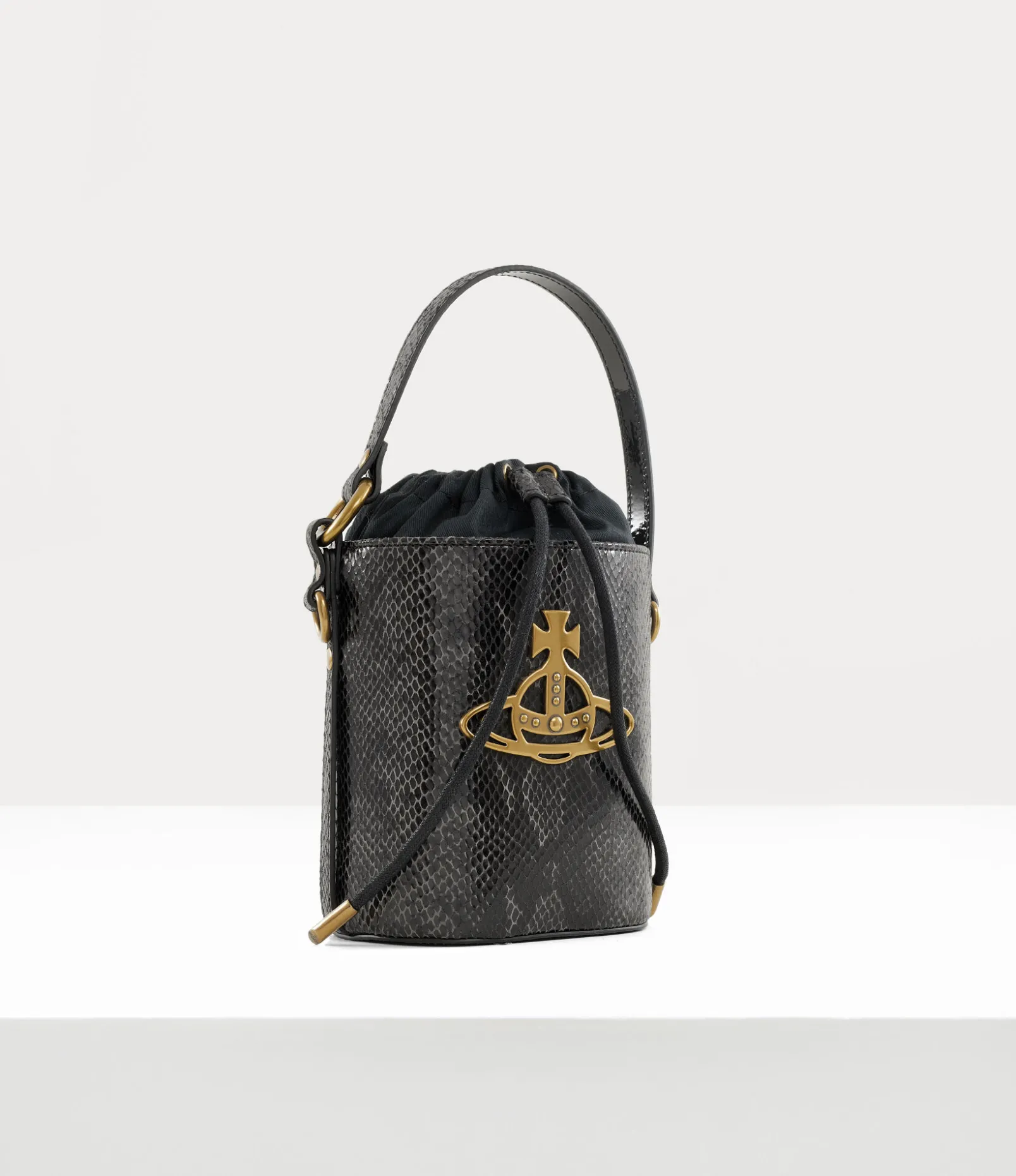 Our Daisy Drawstring Bucket bag receives a python-embossed motif, complete with a drawstring closure. The interior lining features the archive ‘Broken Pinstripe’ lining, which was first introduced in the Autumn-Winter 1993 Anglomania collection, while the line orb plaque on the front panel alludes to Vivienne’s vision for taking tradition into the future.