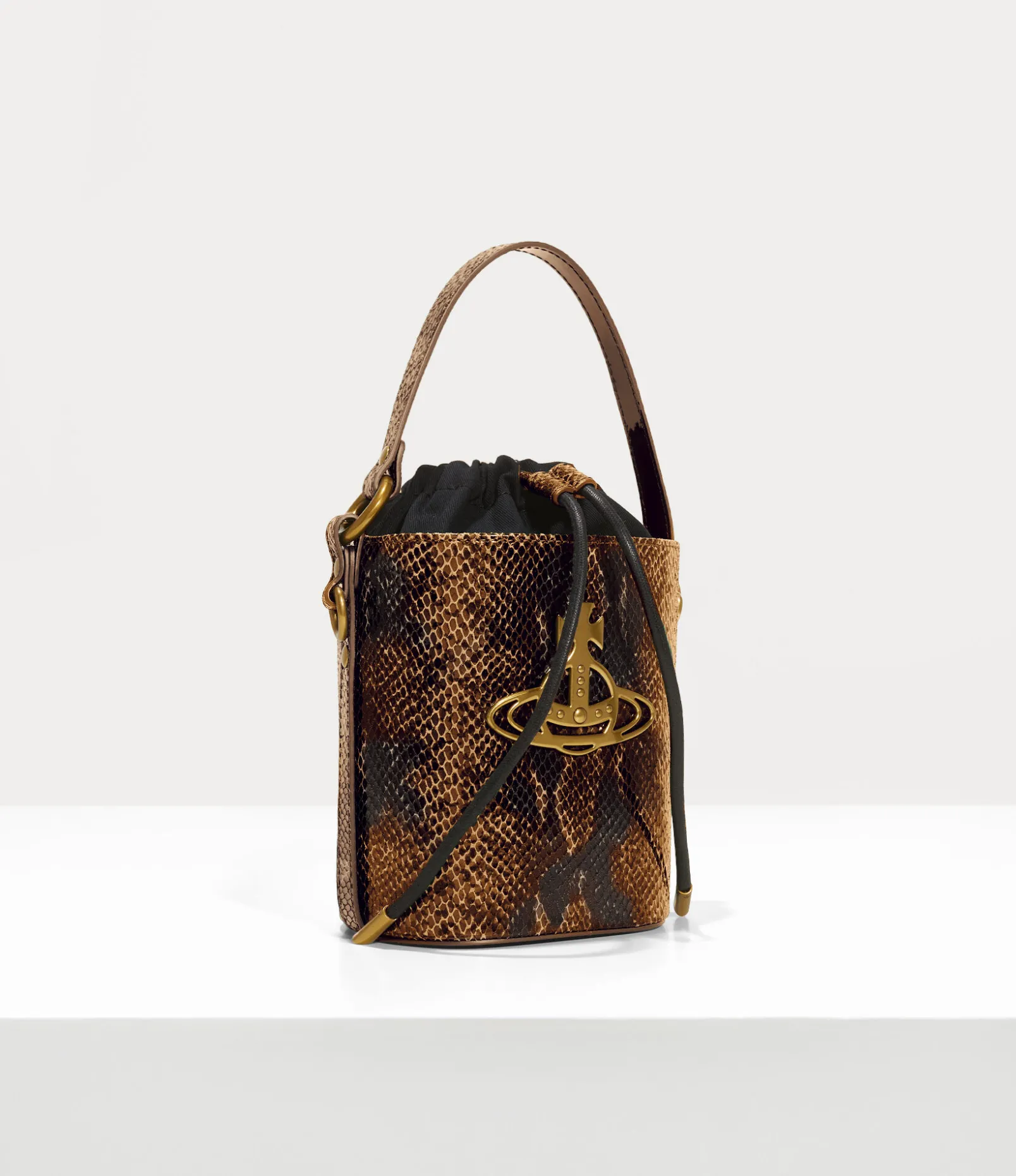 Our Daisy Drawstring Bucket bag receives a python-embossed motif, complete with a drawstring closure. The interior lining features the archive ‘Broken Pinstripe’ lining, which was first introduced in the Autumn-Winter 1993 Anglomania collection, while the line orb plaque on the front panel alludes to Vivienne’s vision for taking tradition into the future.