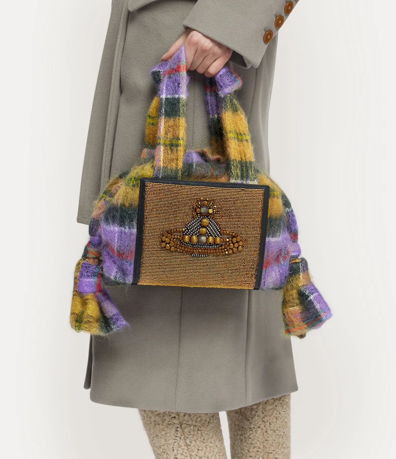 Our Donna handbag is offered in a soft tartan mohair finish this season, created using a unique brushed-effect technique. The tartan motif captures the essence of Scotland’s rugged landscape, which inspires our latest collection, and receives a beaded orb detail on the front panel, hand-finished by the Masai community in Kenya.