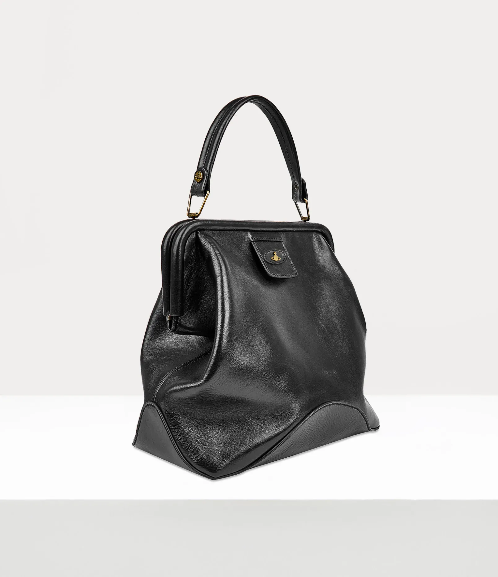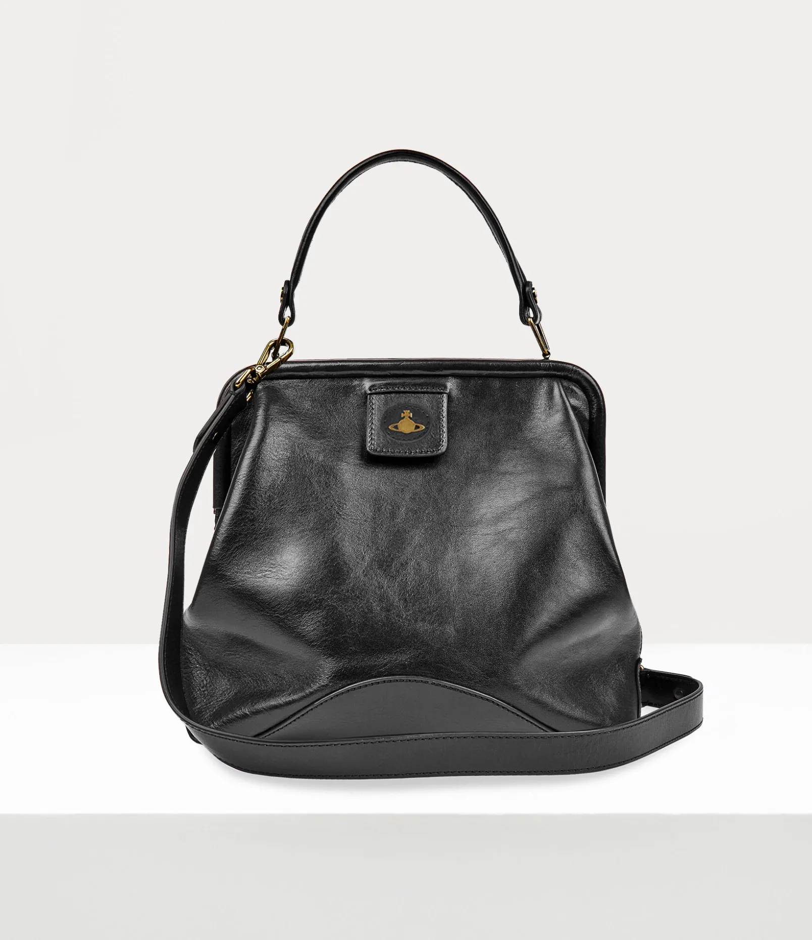 The Abbey Frame handbag, reminiscent of our signature Granny style, is a new design this season, finished in a polished black leather fabric. This piece adopts a slouchy silhouette and an updated version of the iconic orb motif, which Vivienne Westwood used to represent launching tradition into the future, set on top of a raised tab.
