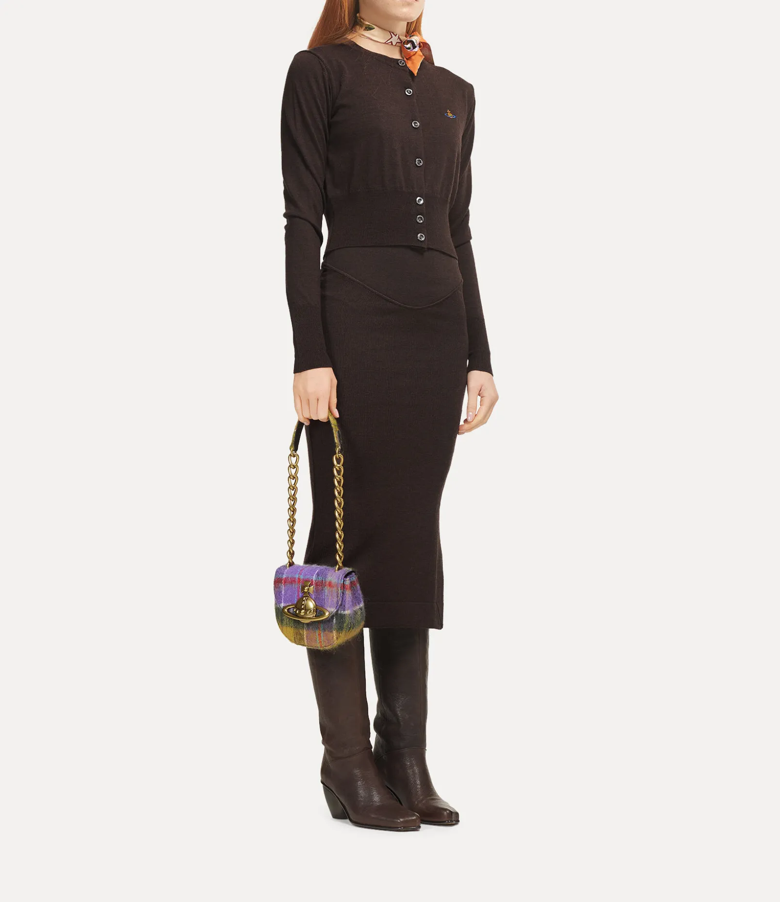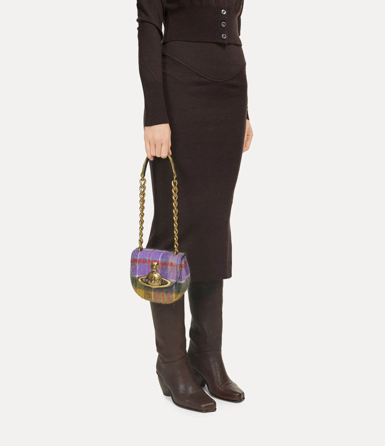 The Vivienne Westwood Jodie Saddle bag returns this season with a tartan mohair finish, which emphasises the Neo-classical inspirations of the collection. The piece adopts the signature broken pinstripe interior lining, a unique twist on the traditional pinstripe, complete with a three-dimensional brass orb plaque – synonymous with Vivienne’s vision of launching tradition into the future.