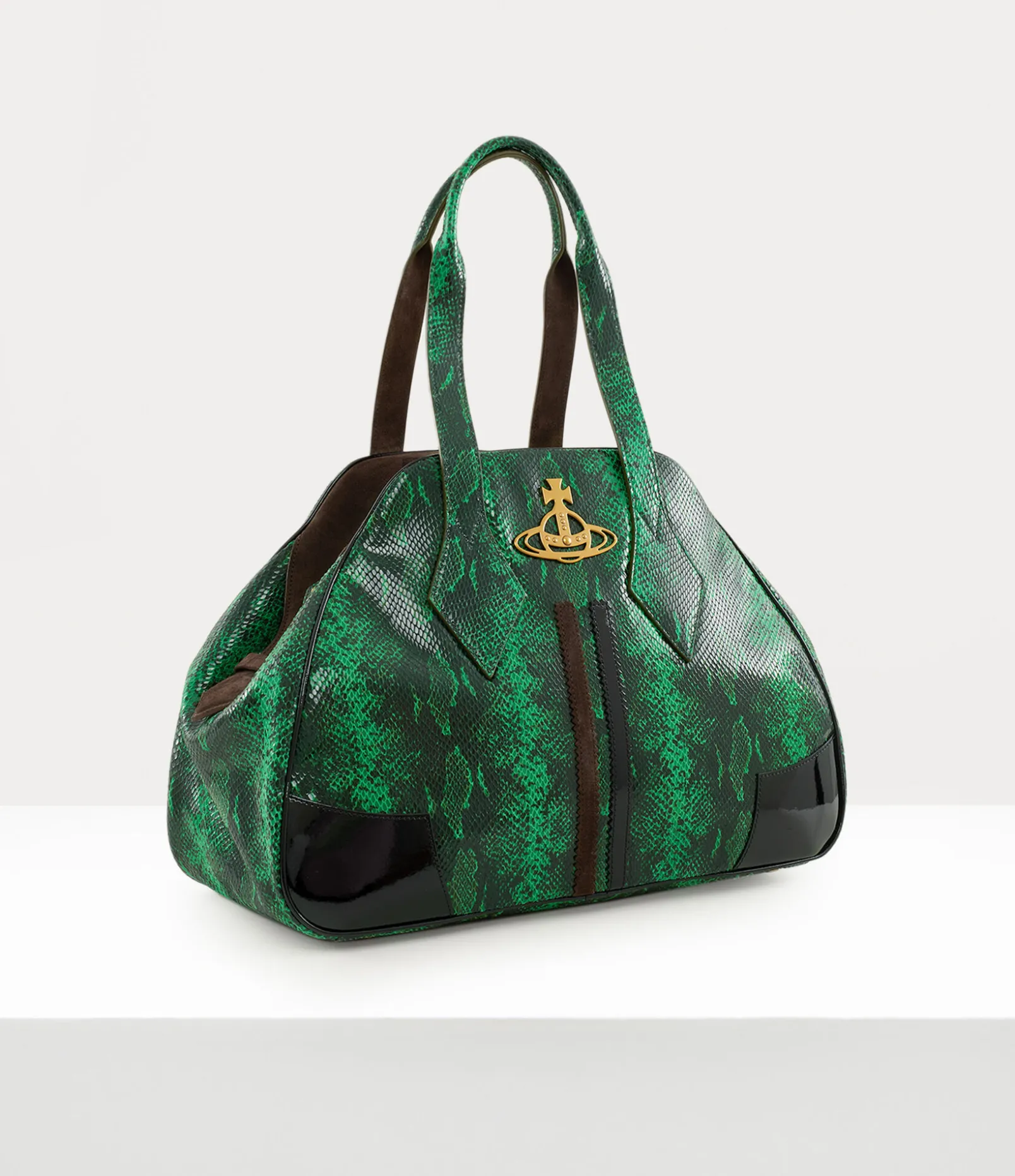 The Large Yasmine bag pays tribute to the iconic ‘Yasmine’ design from the Autumn-Winter 1987/1988 Time Machine collection. This larger version features the new ‘snakeskin’ pattern, inspired by our Hammerhead trainers from the 1982 ‘Savage’ range. The double appliqué down the centre, a nod to the Tracey trainer’s two stripes, adds a sporty touch, while the metal orb plaque on the front symbolises Vivienne’s innovative approach to blending tradition with the future.