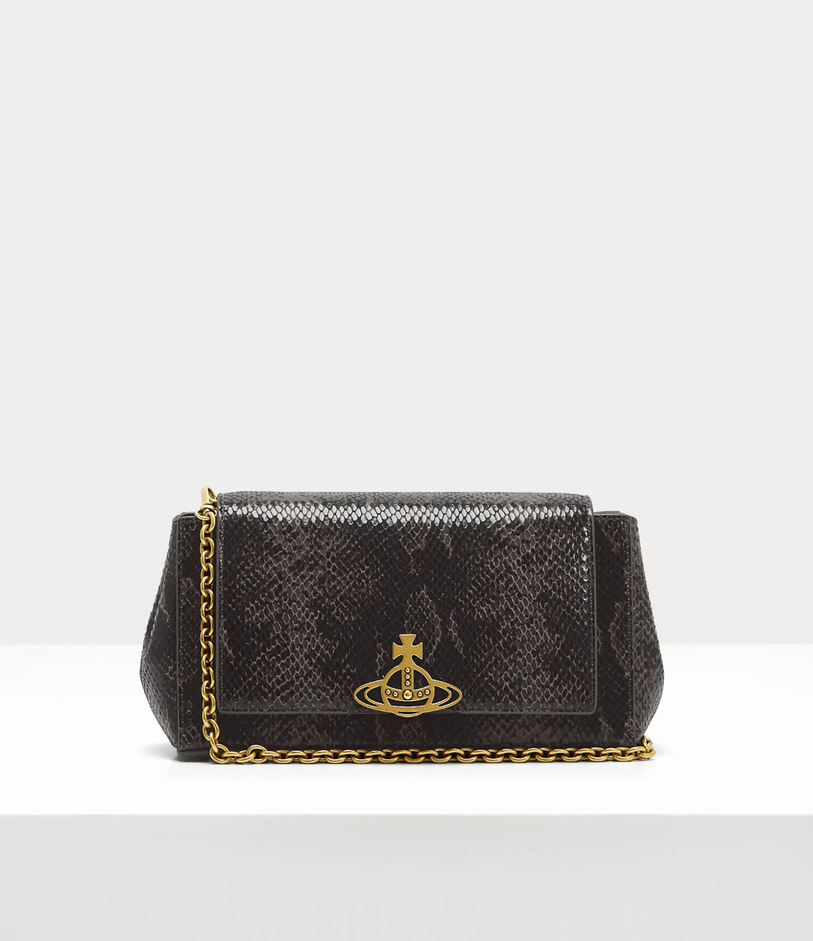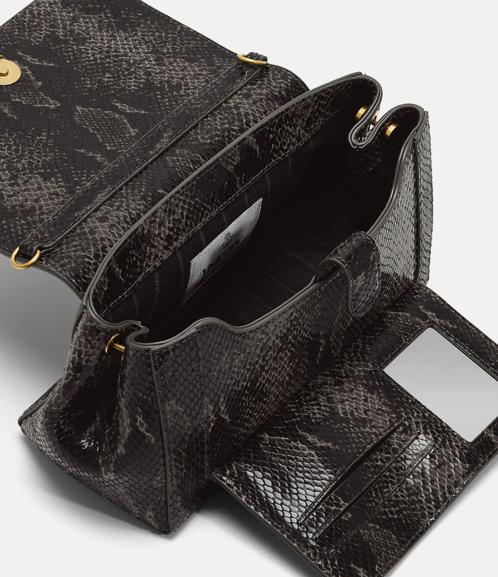 Our Medium Hazel handbag is the latest development of the Hazel range this season. The piece features a python-embossed finish, complete with our signature broken pinstripe lining, a unique twist on the traditional pinstripe pattern, first seen in the Vivienne Westwood Gold Label Autumn-Winter 2015 collection.