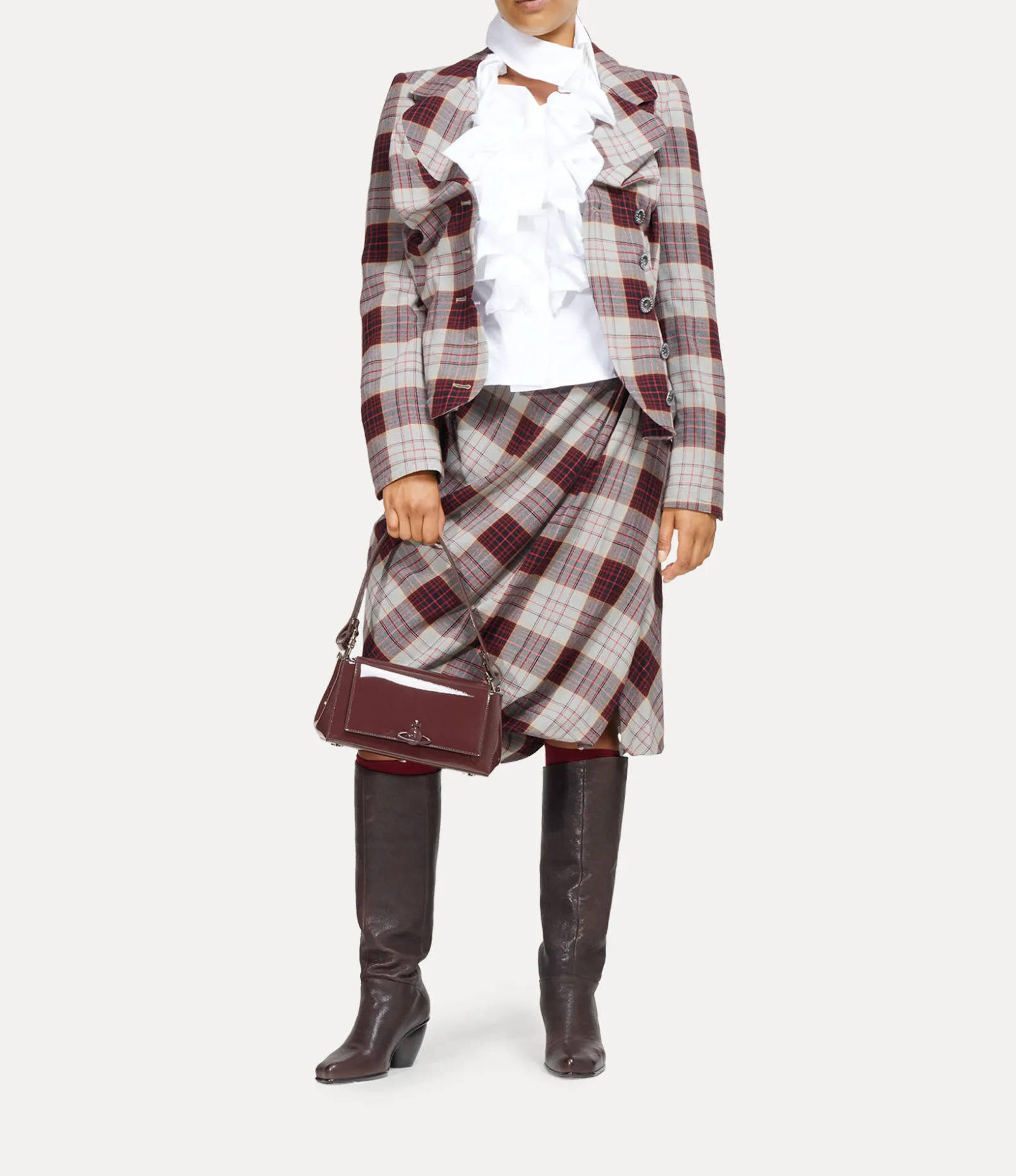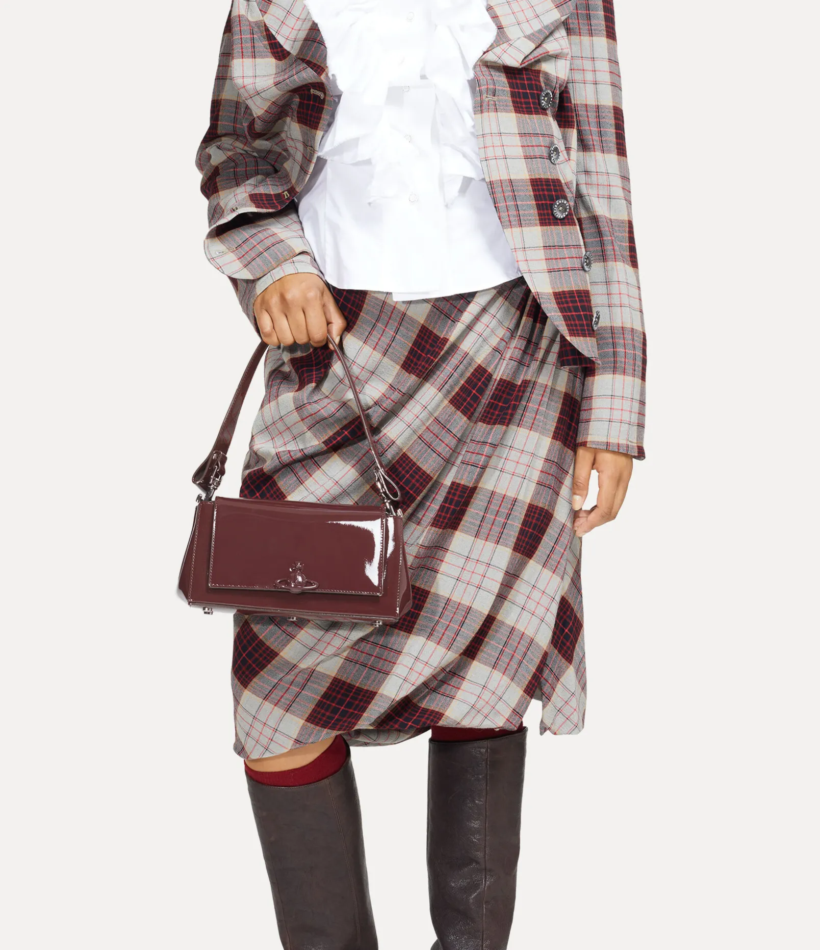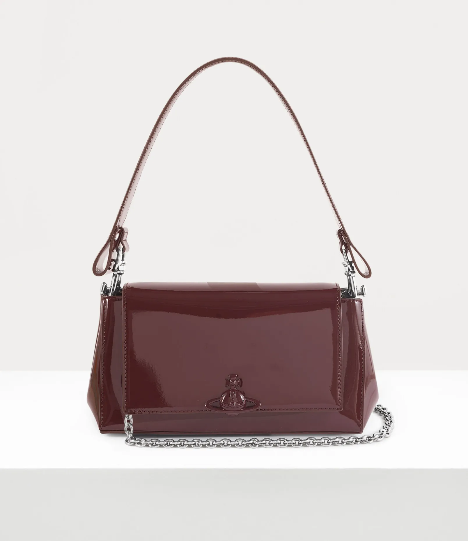 Our Medium Hazel handbag features an all-over patent finish, reminiscent of the liquid latex and rubberwear sold in our iconic SEX boutique, now known as Worlds’ End. The piece is enhanced by our enamel orb branding on the magnetic fastening, evoking Vivienne’s vision of launching tradition into the future, complete with a soft cotton lining.