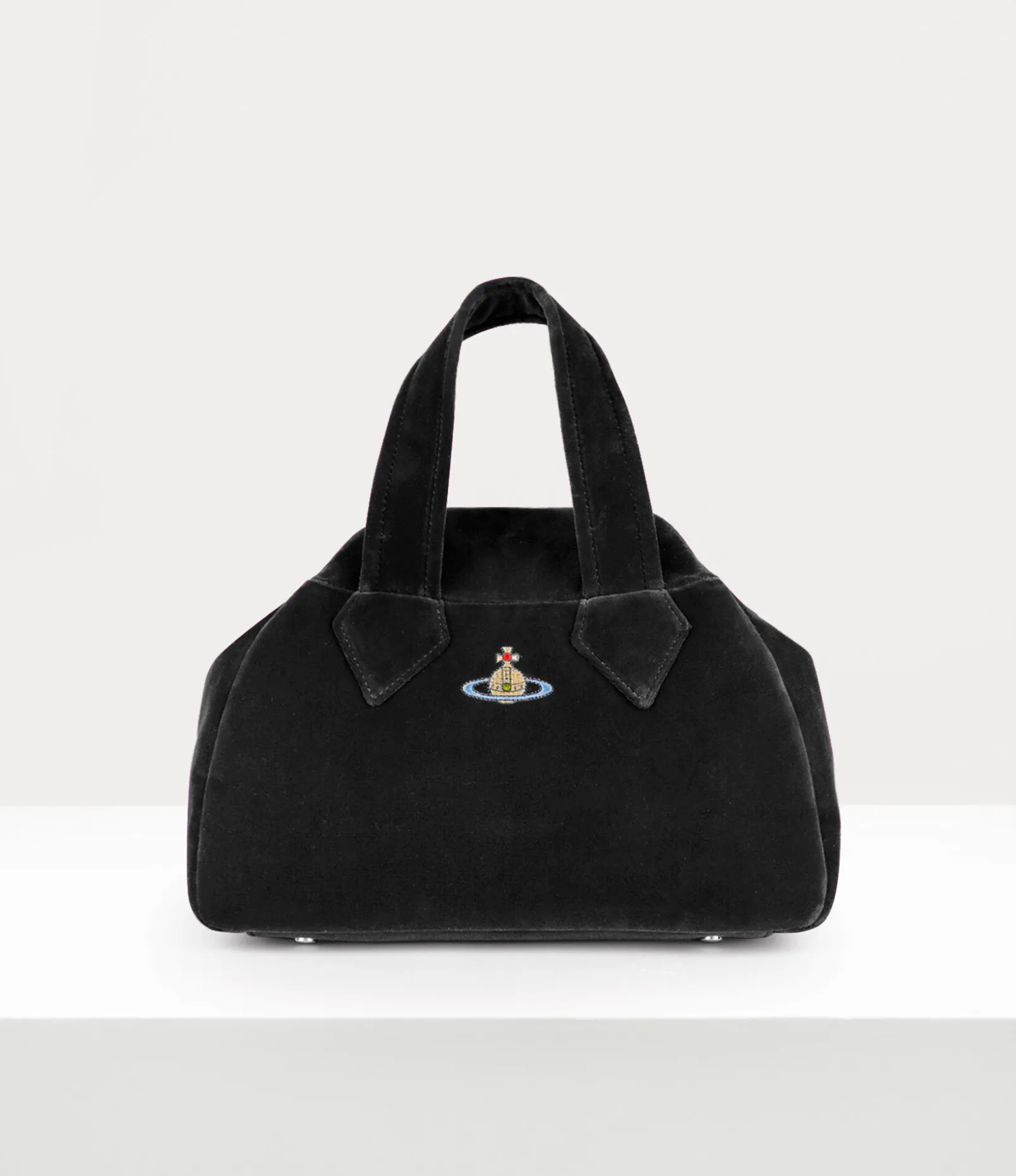 The Medium Yasmine handbag is a new development of our archive Yasmine handbag, first presented at the Gold Label Autumn-Winter 1987/88 runway show titled ‘Time Machine’. This season, the piece receives a soft cotton velvet silhouette, complete with an embroidered orb on the front panel – alluding to Vivienne’s vision of taking tradition into the future.