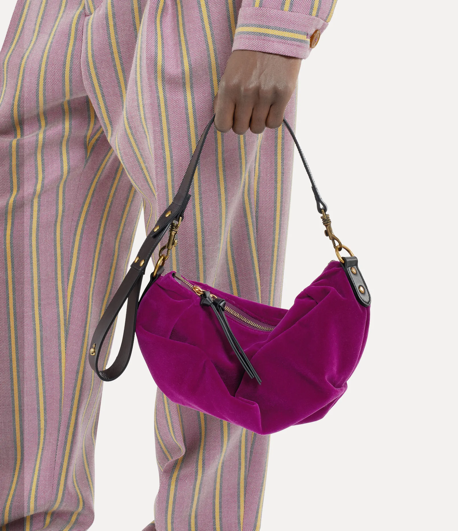 Our Small Agnes Shoulder bag features a unique pattern cutting system inspired by the Autumn-Winter 2001 ‘Wild Beauty’ collection, complete with drapery at the front and a curved silhouette. The handle is reminiscent of the bondage whips sold in our iconic Sex boutique, while the orb-branded strap recalls Vivienne’s vision of launching tradition into the future.
