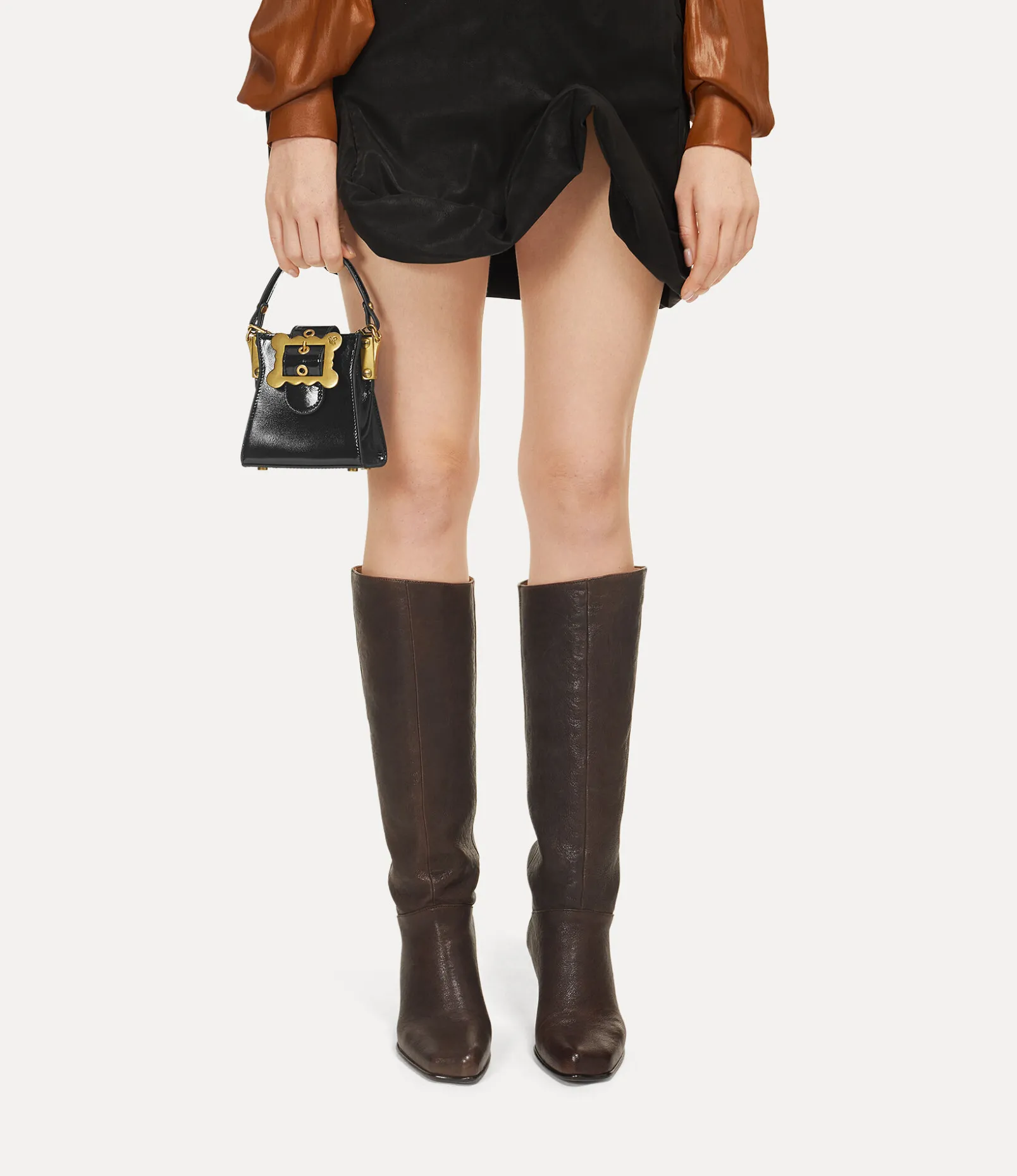 This season, our signature ‘Frame Buckle’ is revived, gracing the strap of the Tuesday Mini Handbag. Inspired by the opulent carved frames that traditionally encase Renaissance masterpieces, this exquisite buckle features an intricately engraved orb in the corner, epitomising Vivienne’s vision of launching tradition into the future.